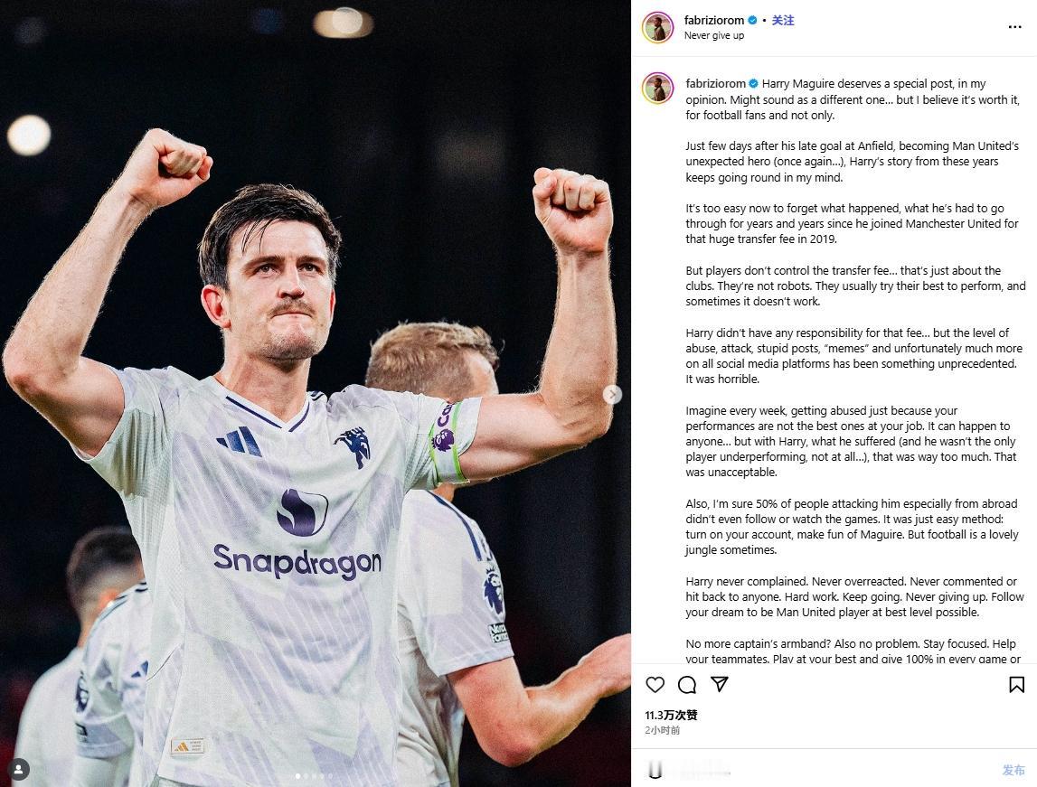 马奎尔从不抱怨,从不过度反应,从不回应任何人。努力训练,坚持不懈,永不言弃。追随梦想,以最佳状态成为一名曼联球员。 失去队长袖标?没关系。保持专注,协助队友,每场比赛、每堂训练课都全力以赴发挥最佳水平。 马奎尔曾经不是一名糟糕的球员,如今他也不是金球奖得主。关键在于那些时刻——无论是足球、体育还是生活。这是一个适用于所有球迷、球员,以及其他运动爱好者乃至普通人的故事。 本人并非曼联球迷,但看曼联的比赛或者新闻,且只关注大头一人!