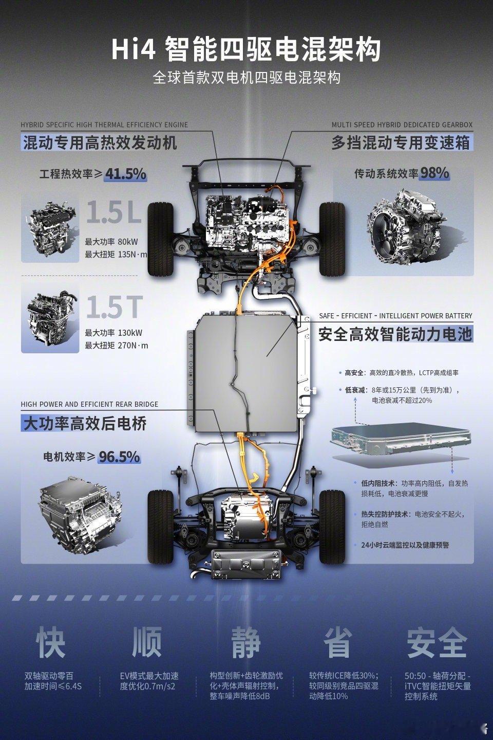 Hi4技术以“全球首创”为核心,构建了新能源混动四驱新范式。突破了双电机串并联构型无法实现四驱的技术瓶颈,构建了可拓展的Hi4混动家族,可满足不同车型、不同场景的全方位需求;同时开发了国内首款单电机9挡并联混动四驱系统Hi4-T,填补国内混动硬派越野技术空白;并凭借全球首款耐高温双VGT增压器及高效燃烧系统,使3.0T发动机实现了全球最高工程热效率,解决了大排量发动机性能效率难以兼顾的问题。Hi4技术体系拥有122项授权发明专利,牵头制定9项国家标准,在动力系统、电池安全与越野性能上实现多项全球突破。