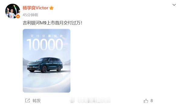 吉利银河官方宣布,M9上市仅1个月,交付总量已突破10000台!