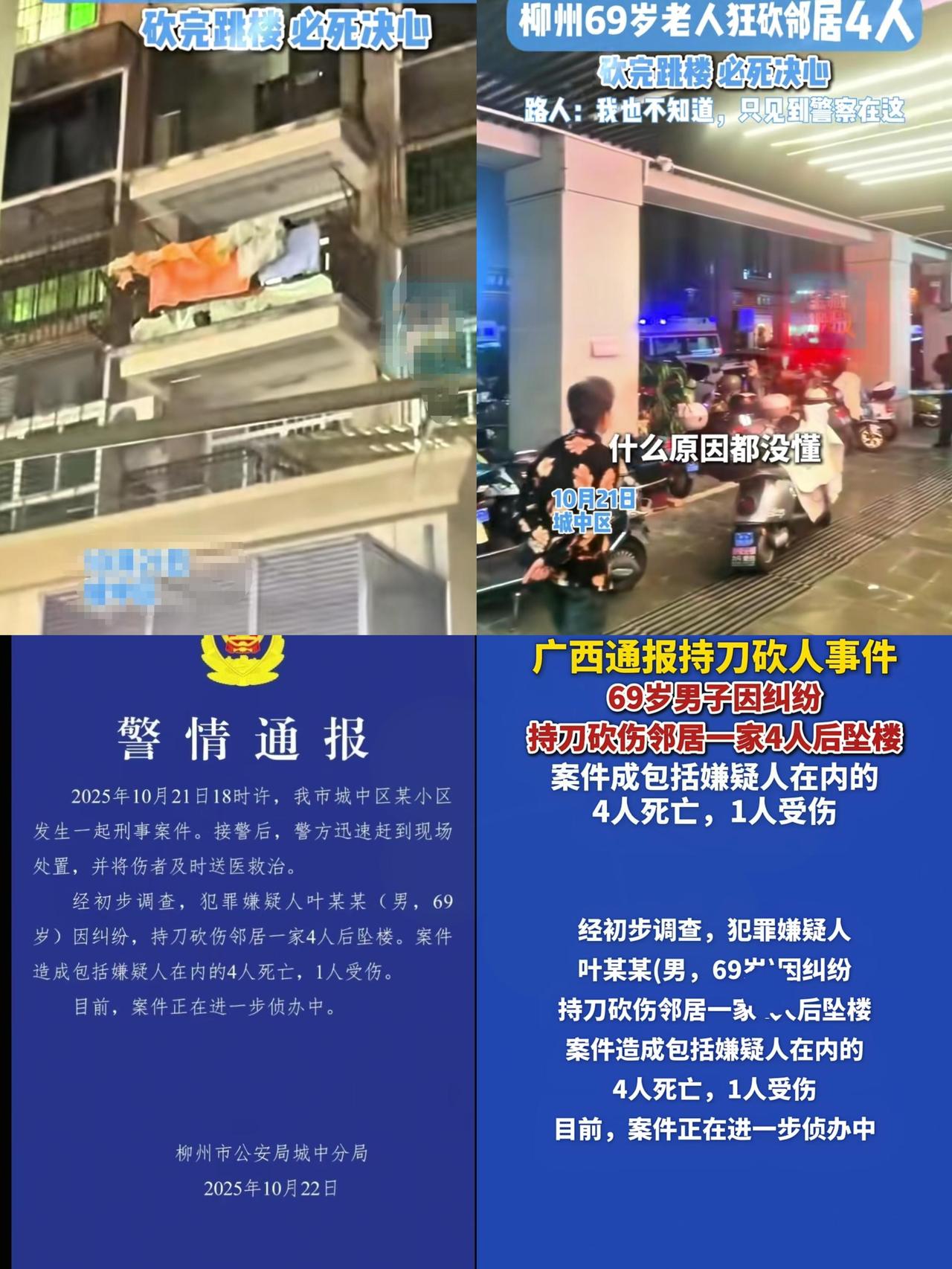 柳州这起邻里悲剧, 真的太让人揪心了! 69岁老人因休息被打扰, 竟伤害邻居一家四口,自己也跳楼身亡,才2岁的孩子没能幸免,想想就难受。 以前说“远亲不如近邻”,现在城里邻居关上门就成陌生人。一点矛盾要么憋着,要么闹僵,少了沟通和包容,小事愣是演变成惨剧,说到底是人心离得太远。 再大的气,也别拿生命赌气!邻里之间退一步、好好说,哪会走到这步? 你遇到过邻里矛盾吗?要是你,会怎么化解?
