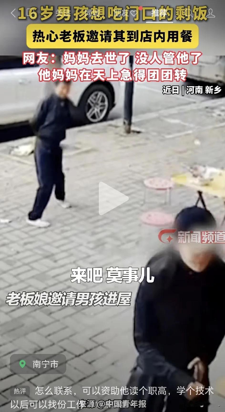 16岁少年在餐馆外徘徊半小时,老板一问原因瞬间破防! 男孩说自己很饿,平常都是捡饭吃,想吃桌上的剩饭。赵先生一听,不忍心让孩子吃冷掉的剩饭,直接说,“我回屋给你下一碗面。” 原来,妈妈去世了,只剩下他一个人生活。因为县城的公交车都是免费的,所以少年早上乘公交车到县城捡饭吃。少年不想要钱,给人家干活,希望可以有个地方给他落脚。 少年一碗面条没吃完,请老板帮他把剩下的打包,然后对着老板夫妇深深鞠了一躬,带着满足的笑、带着半碗面离开。 看完了视频,真的控制不住眼泪。 网友评论: 没有了妈妈,也没有了爸爸了吗,如果都没有了,社区应该给办理低保,孩子在未成年的时候,每个月都会有一笔钱来帮助孩子成为学习,保障孩子的生活。 这个世界还是好人多,真心希望少年能学个安身立命、能养活自己的本事,将来能够养活自己。未来更能够把好心人给他的这份关爱和帮助,再传扬下去,去帮助更多的像他一样需要帮助的人。 老板大气,心善,孩子可怜但还是很乐观,没有被糟糕的生活击垮心理没有扭曲,万幸。 所有的人都巴望着能够健康长寿。一方面是为自己,可以更持久的享受人生。另一方面确实是为了孩子,可以更持久的帮助他们。 善良的饭店老板,好人一生平安!可怜的娃!