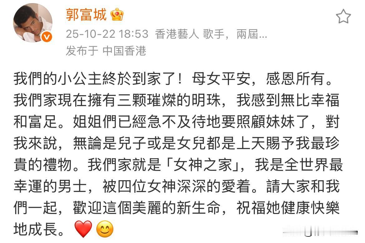 郭富城,开心发文。10月22日,郭富城在自己的社交平台上,开心发文,官宣三胎小