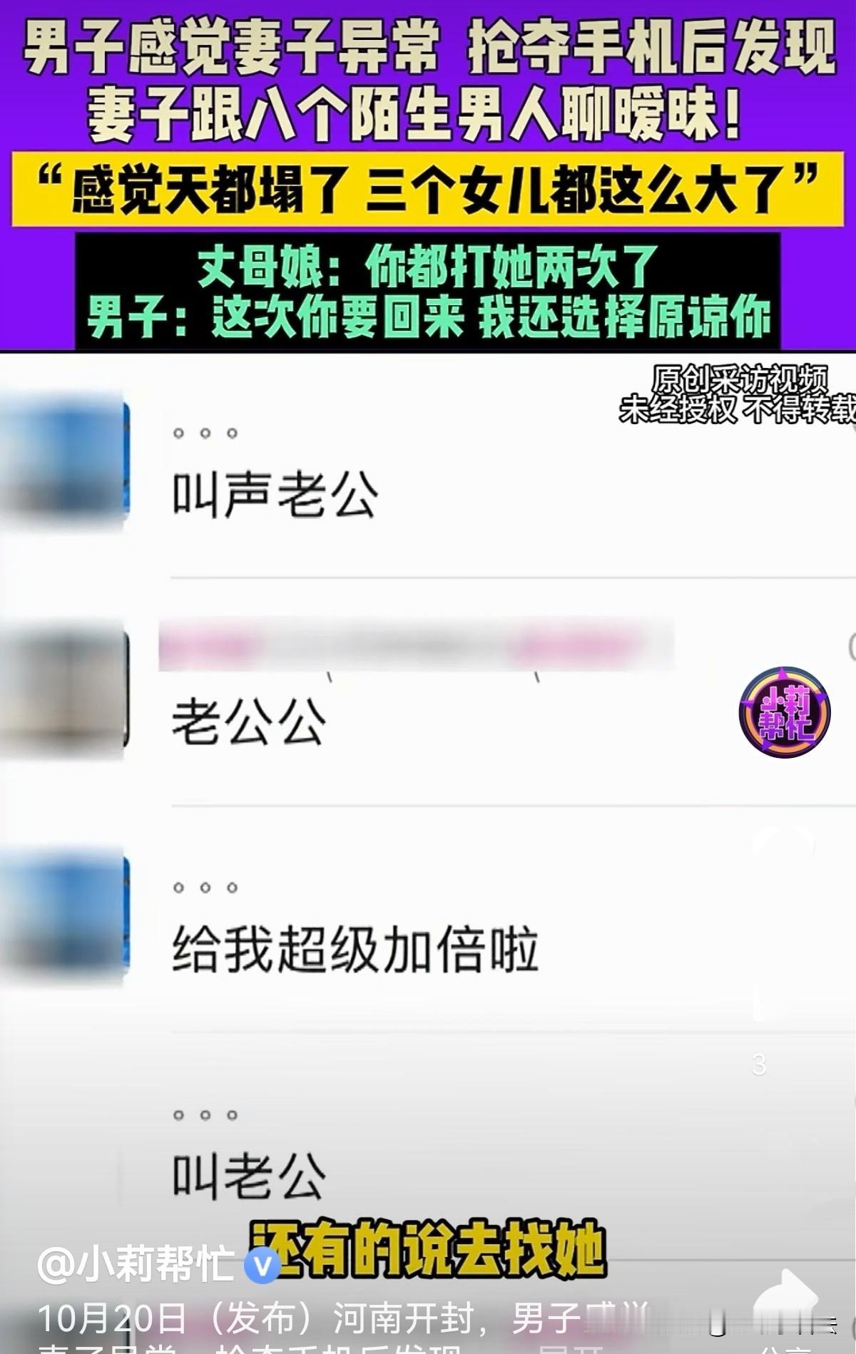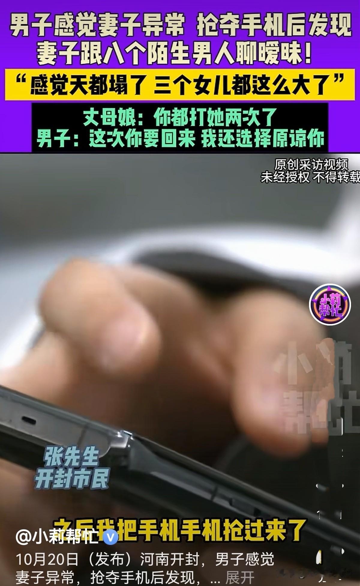 河南开封,男子与妻子结婚17年,生了3个女儿,为了养家,他常年在外打工。因两个大女儿发生意外住院,男子回来在医院照顾女儿,在与妻子电话时发现不对劲,马上赶回家,想查看她手机被拒,两人抢夺手机扭打在一起,男子抢到手机发现妻子3个月内与8个异性聊暧 昧还约会。他质问妻子为啥给自己戴绿帽子,女子毫不辩解直接说离婚,随后就失联了。男子后悔看她手机,说只要回来就原谅她,还赚钱养她!并忏悔没体谅妻子的感受! 张先生常年在外打工赚钱,因为家里有老婆和3个女儿要养,家庭责任感极强。 突然他接到妻子电话,说两个大女儿意外摔伤,他心急如焚赶紧请假回家,来医院照顾女儿。 在与妻子微信时,他听说小女儿从学校回来哭了,便打电话要与女儿说话,妻子说她在看电视不想搭理他。 张先生在电话中并未听到电视的声响,听妻子说话也不对劲,心中生出异样的感觉。 几年前他在外打工,父亲他提醒说,发现妻子与别人有事,他就匆忙赶回来。妻子一再承认错误求原谅,并写保证书,说绝不重犯。 一想到这里,张先生心里咯噔一下,感觉妻子在撒谎,难道妻子又犯老毛病了? 于是,他立马回家想看看妻子在干嘛。结果发现妻子正乐滋滋地捧着手机与他人聊天。 张先生要看妻子在和谁聊天,妻子霸气回怼:你管不着,这没权利看! 妻子的遮掩更让他怀疑,于是他上前就抢手机,妻子不给,两人扭打在一起。 妻子看张先生使真劲,自己根本不是个,索性放手让他看去。 张先生打开聊天记录,当时就傻眼了!妻子从8月开始,3个月内竟与8个男人聊天,他们之间聊的话不堪入目,这样的话,结婚17年间她从来没对自己说过。 并且还和别的男人见面,其中有人开车接她,还有人说来找她。更过分的是,她还叫别的男人老公!他们约会到底做了什么? 这也太没底线了,是个男人也受不了妻子跟别人搞这个!太伤自尊了! 男子气得浑身哆嗦,指着妻子质问:你为什么出轨给我戴绿帽子?谁知妻子不吵不闹不辩解,直接说:那我们离婚吧! 随后妻子就离家出走了,好些天联系不上。 医院里2个女儿,家里小女儿还哭喊着找妈妈,搞得张先生焦头烂额,家里没她不行啊! 可他联系不上妻子,无奈找到记者,让帮他找到妻子。 他对记者说,当时自己很生气,她谈1个也就算了,还一下子谈8个,让我很没面子!可家里有3个女儿,他不想离婚,不想孩子们没妈! 于是,他随记者一起去岳母那边,记者问她知不知道女儿在哪里?会不会跟着别的男人走了? 岳母只说知晓女儿要离婚的事,却牙口缝不漏女儿在哪里,啥都不知道!她说自己手机被女儿拿走了,没法与她联系。女婿打过女儿2次,所以女儿才要离婚。 张先生承认打过妻子,那次她与别的男人搞那个打了她,她说改正好好过日子。谁知,她变本加厉一下搞8个,才一时没忍住打了她。 妻子一直不承认自己有错,就说是张先生的错,说他不该抢她的手机。不过现在他也后悔了,觉得不该抢她手机看她聊天记录。这下妻子跑了,连人都找不到了! 他说妻子有错,自己也有错,自己常年在外面打工,经济由妻子掌管,只知道给她钱,忽略了她其他感受! 妻子生气就离家出走了,失联很多天了,女儿哭着说想妈妈要妈妈,他不能没妻子!孩子不能没妈妈! 他对着记者的话筒说:你回来吧,只要回家,我再原谅你一次,我们赚钱一起养着你! 《民法典》第1043条规定:夫妻应当互相忠实,互相尊重,互相关爱;夫妻双方在道德和法律层面都应保持对彼此的忠诚。 《民法典》第1091条规定:若因重婚、与他人同居、实施家庭暴力、虐待或遗弃家庭成员,或有其他重大过错导致离婚的,无过错方有权请求损害赔偿。 妻子在 3 个月内与 8 个异性聊暧昧还约会,这种行为明显违背了夫妻之间的忠诚义务。 妻子的行为严重伤害了夫妻感情,如张先生向法院提起离婚诉讼,法院在调解无效的情况下,应当准予离婚。 同时,由于妻子的行为存在过错,张先生作为无过错方,有权请求损害赔偿,包括物质损害赔偿和精神损害赔偿。 事实却适得其反,妻子要离婚玩失踪,张先生喊话原谅她,让她回家。 如妻子不离婚真跟别人过了,既违背道德也违法! 《民法典》第1042条规定:禁止家庭暴力。 《民法典》第1032条规定:自然人享有隐私权。任何组织或者个人不得以刺探、侵扰、泄露、公开等方式侵害他人的隐私权。 妻子不忠被公公发现后,告知张先生,而后,他再次怀疑妻子不忠,并要求看妻子手机被拒后,便开始抢夺手机。他2次打了妻子,实施了家庭暴力行为。 他在妻子不允许的情况下,妻子打开妻子的聊天记录,发现她与8个男人聊暧 昧,这属于侵犯了妻子的隐私权,无形中是对妻子的伤害。 由于张先生处理问题不冷了,方法不正确,让他的婚姻面临危机,他喊话原谅妻子,可妻子是否能原谅他就不好说了! 有人说张先生实在是太难了! 对此您怎么看?