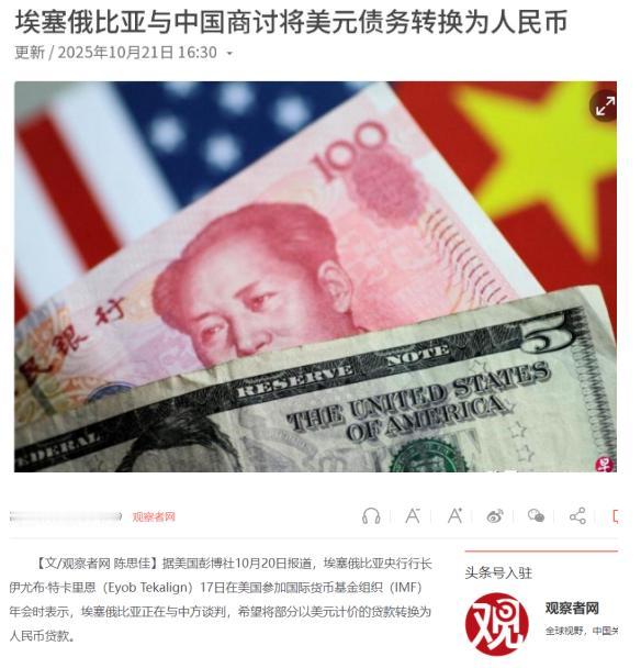 我们出了一个高招,美国估计要跳脚了!10月21日,根据外媒报道,外媒称,埃塞俄比亚与我们正在进行谈判,计划将其欠中国的部分美元债务,转换为以人民币计价的贷款。埃塞俄比亚央行行长特卡林在受访时表示,他上月访问北京时,与中国进出口银行和中国人民银行就潜在的货币互换展开讨论。 这事儿到底有多厉害?先瞅瞅埃塞这几年被美元坑成啥样。过去五年,他们的货币(叫比尔)兑美元一路狂跌,就2022年一年,直接贬了33%,相当于老百姓钱包里的钱一下少了三分之一! 更要命的是,埃塞欠的外债里,有74亿是欠中国的,这钱占了他们GDP的8%。再加上美国一直在加息,欠的美元利息越滚越多,埃塞每年光还钱就得花掉政府20%的收入。现在他们手里的外汇储备就剩35亿美元,连买粮食、买石油的钱都快不够了,简直被逼到绝路上了。 为啥埃塞突然想换人民币?道理特简单:美元这东西,用好了能救命,用不好能把自己坑死。这些年美国为了自己的经济,一会儿加息一会儿降息,把全世界当韭菜割。埃塞就这么个小国,根本扛不住这种波动。换成人民币就不一样了,中国和埃塞的贸易一直很稳,去年埃塞卖给中国2万吨咖啡,这占了他们咖啡总出口的7%。 而且中国还给了非洲国家所有商品零关税的待遇,埃塞的皮革、鲜花这些特产,在中国卖得越来越火。更关键的是,中国和埃塞一起建了亚吉铁路,这条铁路每年能运950万吨货,比走公路便宜30%,现在就是埃塞的经济命脉,用人民币结账,能直接少担点汇率波动的风险。 其实埃塞也不是第一个这么干的非洲国家。阿根廷去年就跟中国续了350亿人民币的货币互换协议,埃及上个月刚跟中国签了合作文件,要推本币结账。这背后其实是个大趋势,大家都不想光靠美元了。 世界银行有数据说,非洲国家的外债里,74%都是美元债务,而西方那些私人债主占了35%,是中国的三倍还多,可他们根本不愿意帮着重组债务。反观中国,已经跟19个非洲国家签了缓一缓还钱的协议,在G20里,中国是给非洲缓债最多的国家。 不过美国肯定不能眼睁睁看着这事成。之前阿根廷跟中国合作的时候,美国就跳出来说这是“债务陷阱”,结果被阿根廷直接怼回去了。这回埃塞这事儿,美国虽然还没明说,但用脚想也知道,他们又会拿“人权”“透明不透明”这些当借口施压。 可埃塞现在顾不上这些了,他们要的是实实在在的经济稳下来。现在埃塞政府正搞工业化,打算建15个工业园,中国企业在那儿投了300多个项目,给当地造了30多万个工作岗位。要是这次债务能转成人民币,埃塞就能腾出钱搞基建、发展农业,自己的命运自己攥着。 对中国来说,这也是一步好棋。人民币要在国际上好用,不能光喊口号,得让别的国家真尝到甜头。埃塞这种非洲国家,是“一带一路”上的重要伙伴,帮他们解决债务问题,既能处好关系,又能让人民币在非洲用得更开。 现在全世界有42个国家跟中国签了货币互换协议,总共是4.3万亿人民币的规模,人民币跨境支付系统(CIPS)都覆盖109个国家了。这就跟下围棋似的,中国正一步步搭自己的金融圈子。 当然,这路也不是一帆风顺的。埃塞国内经济太单一,主要就靠卖咖啡撑着,人民币结账能不能真落地,还得看两国贸易能不能再深点、再广点。但有一点肯定,等越来越多国家开始用人民币代替美元,美国的金融霸权就会松动。 这不是你输我赢的事儿,而是让国际金融体系更公平、更稳当的必经之路。埃塞这次敢尝试,可能只是个开头,以后会有更多国家跟着来。毕竟,谁也不想再被美元牵着鼻子走啊!