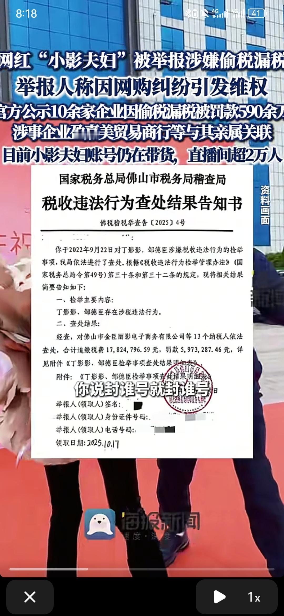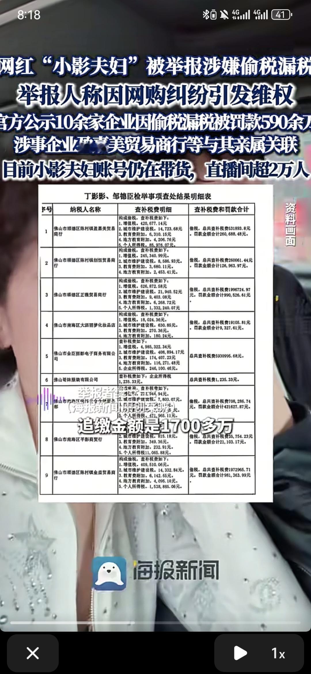 百万粉丝网红“小影夫妇”逃税!还不是一笔小数目,就在网友期待查杜星霖夫妇的税时,“小影夫妇”在直播间嚣张回应 “小影夫妇”在网上直播带货,粉丝也快近千万级别,收入可想而知,逃掉的税也不是小数目 他们还在直播间称自己是纳税大户,我看是“逃税大户”吧。13个纳税人被依法查处,合计追缴了近1800多万,罚款近600万