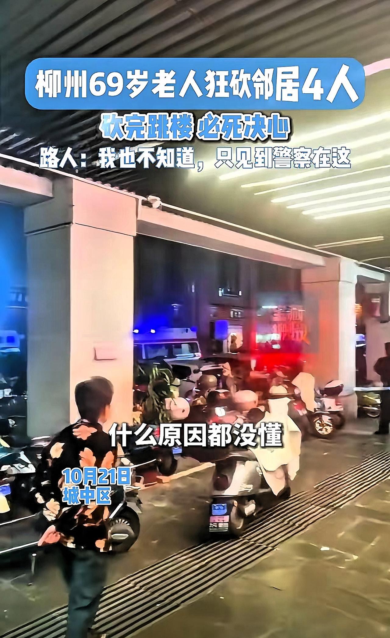柳州五星街惨剧!69岁老人砍伤邻居4口后跳楼,这道“墙”该拆了! 刷到柳州这事儿时,心一下揪紧了——69岁老人住在五星街附近,就因为楼上34岁邻居家打扰休息,气不过竟做出极端事。楼上一家三大人带个2岁娃,没能护住孩子,4口都被伤了,老人最后抱着必死决心跳了楼,小区被警察团团围住,路人采访都说不知情,只看到满街警戒线。 小时候常听“远亲不如近邻”,可现在城里单元门一关,邻居成了最熟悉的陌生人。这点纠纷要是早有人搭个话、劝两句,何至于走到这步?说到底,不是戾气重,是我们把“隔壁”的距离拉得太远,小矛盾没人管,才憋成了大悲剧。 你住的小区里,和邻居熟悉吗?要是遇到这种小事,你会主动帮忙调解吗?