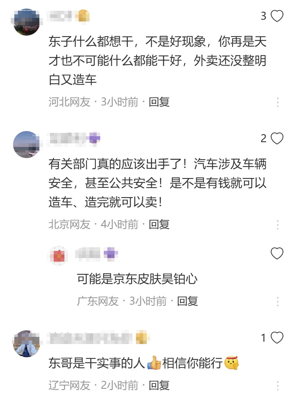 刘强东联合广汽、宁德时代攒的“国民好车”今儿露脸了,车圈立马炸了锅。这款瞄准10万-12万大众市场的5座小型轿车,续航401-600公里刚好覆盖日常通勤和周末耍,价格直接扎进比亚迪海豚、零跑C10的堆儿里,摆明了要抢性价比的“红海”生意。 安全配置挺下本,高强度钢占了七成,侧面用了特斯拉同源的一体式热成型双门环,跟个铁桶似的抗造,麋鹿测试能跑75公里每小时,在小型车里算拔尖的。补能是宁德时代的“巧克力换电”,就像换手机电池似的,三分钟搞定——这主意准是京东用用户数据摸出来的,毕竟手里有几亿烦充电慢的事儿。 有意思的是,京东反复说自己不直接造车,就是“攒局”找专业的人干专业的事:广汽负责生产,宁德时代管电池,自己拿用户数据帮着定配置,再家养车门店做服务,海外还搞了小鹏的备件仓库撑售后,产业链串得倍儿全。当年投蔚来的时候,刘强东听李斌讲15分钟项目,10秒钟就拍板,现在终于把汽车的事儿整出了完整模样,这股子果断劲儿还在。 为了把这事做扎实,京东正高薪挖人,汽车零售算法岗给123万,采销负责人也给到110万,还注册了“京东汽车”一堆商标,架势摆得够足。有人说京东学小米,但其实路子不一样——小米是自己建工厂搞自研,京东是靠整合资源吃平台的饭,手里的用户数据就是底气,知道大家想要啥,比瞎造强。 这款车双11一发布,能不能戳中老百姓的痒处?京东攒的这个汽车局,到底是能成事儿还是瞎折腾?
