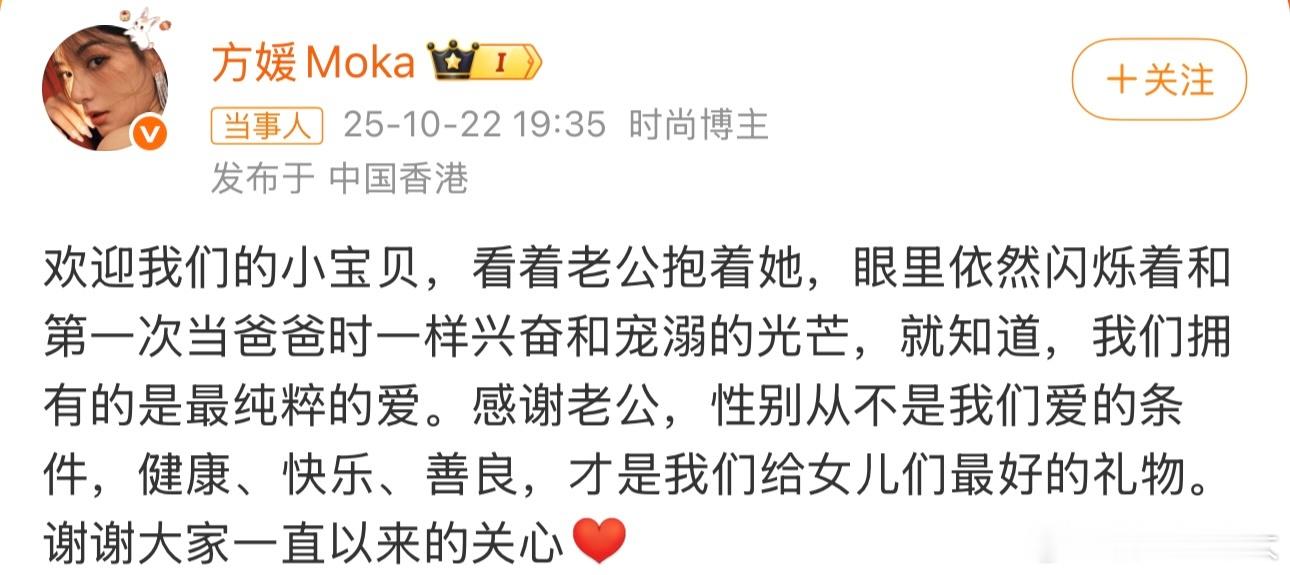 方媛产下三胎,小女儿出生咯,郭富城发文尽显爱意,母女平安,真是可喜可贺,方媛也发文回应:性别从不是我们爱的条件,健康、快乐、善良才是给女儿最好的礼物,不得不说夫妻俩真的很恩爱啊。