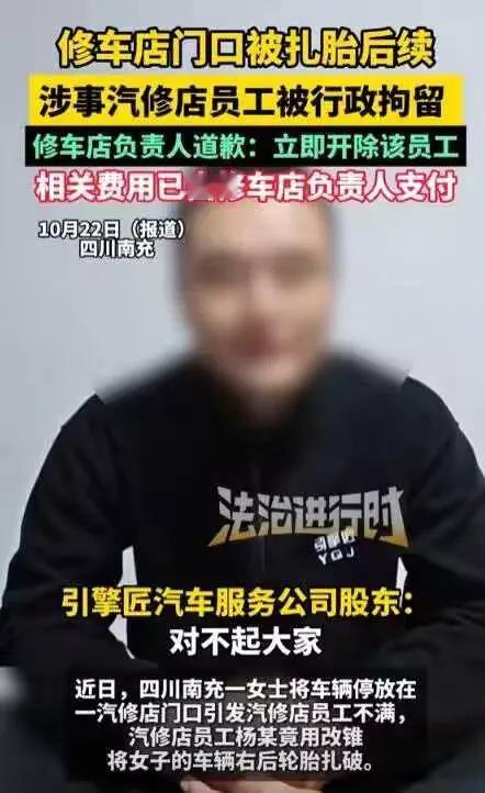 公共车位成私产?四川南充一家修车店,因为一个临时停车的女士,彻底火了! 10月18日,罗女士办事时把车停进路边划线的公共车位,却被修车店用铁板挡路,店员扬言敢停就拖车。结果十分钟后回来,车胎被扎穿,车辆还被前后堵死!特斯拉哨兵模式拍下全程。黑衣员工拿改锥一戳就跑,嚣张到对镜头比剪刀手。 更绝的是,店家事后竟发视频喊冤...“我们错哪儿了?”网友瞬间炸锅!深扒发现,这家店不仅占车位,还私拆路边石,砍行道树,简直无法无天。警方最终顶格处罚!扎胎员工行政拘留10天,店铺因涂改公共标线罚2万,股东连夜道歉开除员工。可网友根本不买账,道歉是假,怕影响生意是真! 这事儿闹的,看似争个车位,实则是霸道经营踢到铁板! 公共资源岂容强占?法律教做人,舆论更诛心!新开的店如今门可罗雀,妥妥的社会性死亡。 早知如此,当初好好说话不行吗?