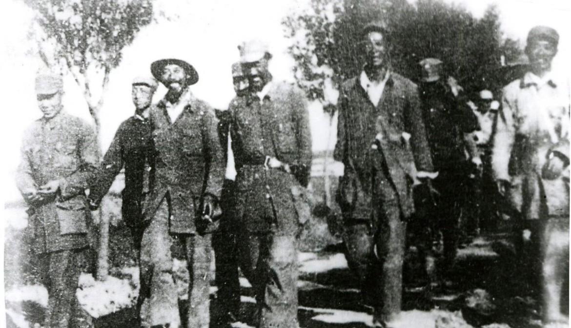1946年,陕甘宁边区,王震(左,戴头盔者,中原军区副司令员兼参谋长) 、郭鹏(右、三五九旅旅长)、王恩茂(中、三五九旅政委)