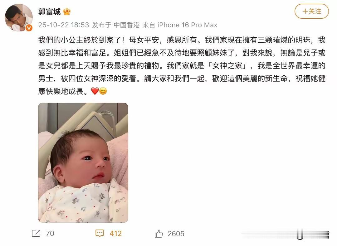 郭富城刚刚晒出全家福,59岁的他第三次当爸爸了。小公主平安出生,他在社交平台上难