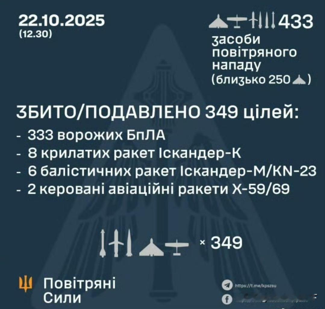 乌克兰武装部发布了“吹牛”战报! 10月22日,俄军向乌克兰全境发射了405架各式无人机,其中250架“天竺葵”空中小摩托无人机。11枚弹道导弹!9枚“伊斯坎德尔-K”导弹!4枚Kh-47M2匕首高超音速导弹!4枚Kh-59/69战术巡航导弹。 乌军防空部队新闻处发布信息称,他们击落了俄军333架无人机,8枚“伊斯坎德尔-K”导弹,6枚弹道导弹,2枚Kh-59战术巡航导弹! 乌军发布的这些战报水分非常大,就拿“伊斯坎德尔”战术导弹来说,乌军防空系统根本很难拦截,什么叫战术导弹?飞行速度快,飞行过程中突然变轨,乌军拦截率那么高,那只能是地面目标拦截了。