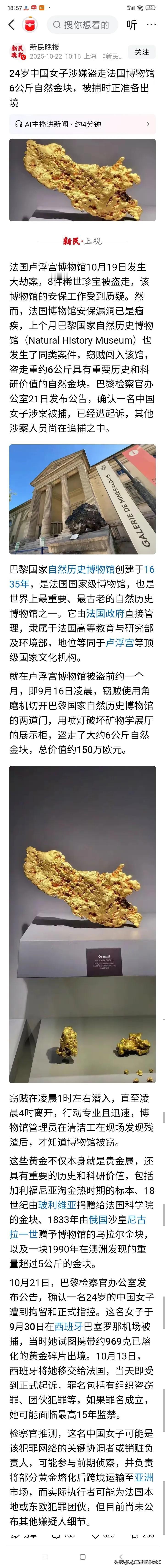 24岁中国女子上演现实版"博物馆惊魂夜"!藏身闭馆后熔毁展柜,6公斤金块不翼而飞。半月后西班牙机场被捕,行李箱里竟藏着这样的秘密... 这名胆大包天的女贼在巴黎国家自然历史博物馆里上演了一出好戏。趁着闭馆前的混乱潜入,像影子一样藏了整整七个小时。深夜的博物馆里,角磨机的嘶吼声格外刺耳,坚固的安保设施在她面前形同虚设。 她手持专业焊枪,三千度烈焰轻松熔化防弹玻璃。那些见证历史的金块,转眼成了她囊中之物。五公斤重的澳洲金块,比足球还大的稀世珍品,就这么轻易被盗走。 令人震惊的是,这已经是法国两个月内第四起博物馆被盗案!安保系统如同虚设,警报器遭网络攻击完全失灵。博物馆方面直到第二天开馆,才发现展柜已空空如也。 她带着战利品一路逃到西班牙,却在巴塞罗那机场现了原形。行李箱里那些被熔化的金块,裹着黑色氧化物伪装成废料,终究没能逃过警方的火眼金睛。 这些被盗的金块,每一件都是无价之宝。沙皇尼古拉一世的赠礼,淘金热时期的珍品,都是不可再生的文化遗产。它们的价值,岂是150万欧元能够衡量? 一个24岁的年轻女子,竟能单枪匹马完成如此"壮举"。这份胆识和才智若用在正途,该有多好。可惜聪明反被聪明误,等待她的将是漫长的铁窗生涯。 各位读者你们怎么看?欢迎在评论区讨论。