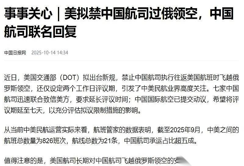 我今天算是开了眼了。 美国人说,我们飞他那儿的航班,不准从俄罗斯上空过。 理由是:这对他们的航空公司“不公平”。 我当时就琢磨,这不对劲啊。 你们家航空公司为啥不能飞俄罗斯领空,自个儿心里没点数吗? 你先动手制裁人家,人家才不让你过。 这是你自己惹的事儿,你自己造成的后果。 现在你回过头来,气急败坏地跟我们说:“不行!你也不能走!你走了就是对我耍赖!” 这是什么神仙逻辑? 这不就等于,你跟邻居老王闹掰了,不从他家门口那条近道走了,宁可天天绕远路。 然后你看见我从老王家门口抄近道,你急了,堵我门口说,你这是不公平竞争! 拜托,大哥,是你自己跟老王闹掰的,不是我啊。 更好笑的是,前脚还天天举着环保大旗,喊着让我们节能减排。 后脚我们选了条最近、最省油的航线,你又跳出来拦着。 一趟航班,省两三个小时,省十几万的油钱,这不就是最实在的环保吗? 合着你们家的“环保”,就是个薛定谔的猫,全看你心情? 说白了,就是牌打烂了,想掀桌子。 想用这种上不了台面的小动作,来掩盖自己政策的失败。 可惜啊,时代变了。 自己生病,却逼着别人吃药,这招不好使了。 最后这多出来的机票钱,这多折腾的时间,还不是得让两边的老百姓自己扛。 何必呢。 非要把路走窄了,最后只会搬起石头砸自己的脚。