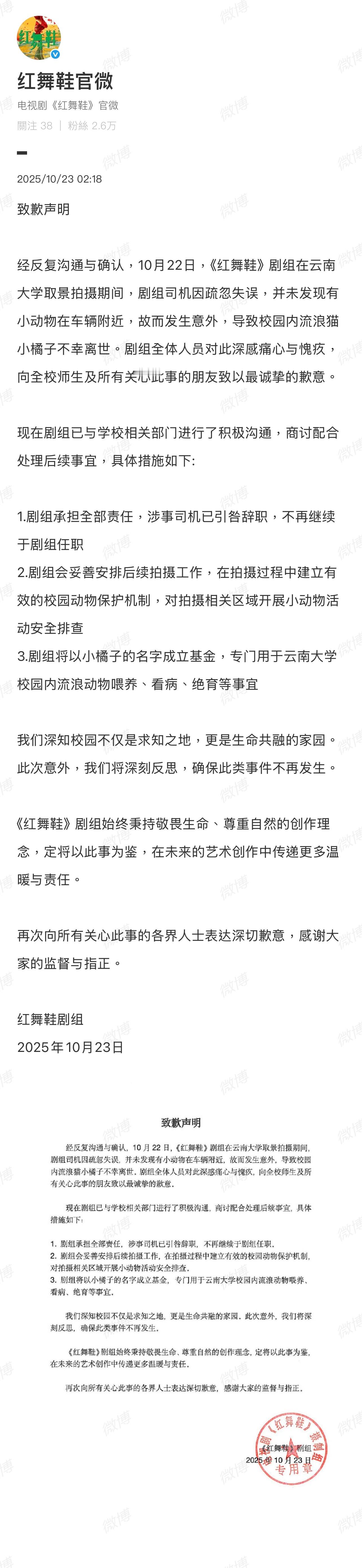 网传《红舞鞋》剧组在学校拍戏撞了一只猫,随后剧组道歉了,该剧由周也王子奇等主演![吃瓜][吃瓜][吃瓜]曝红舞鞋剧组开快车撞死猫红舞鞋致歉声明