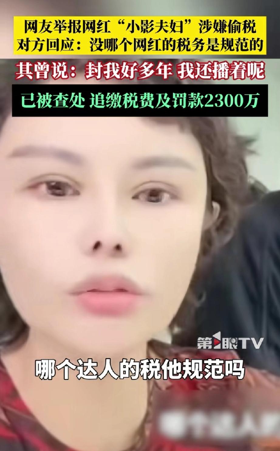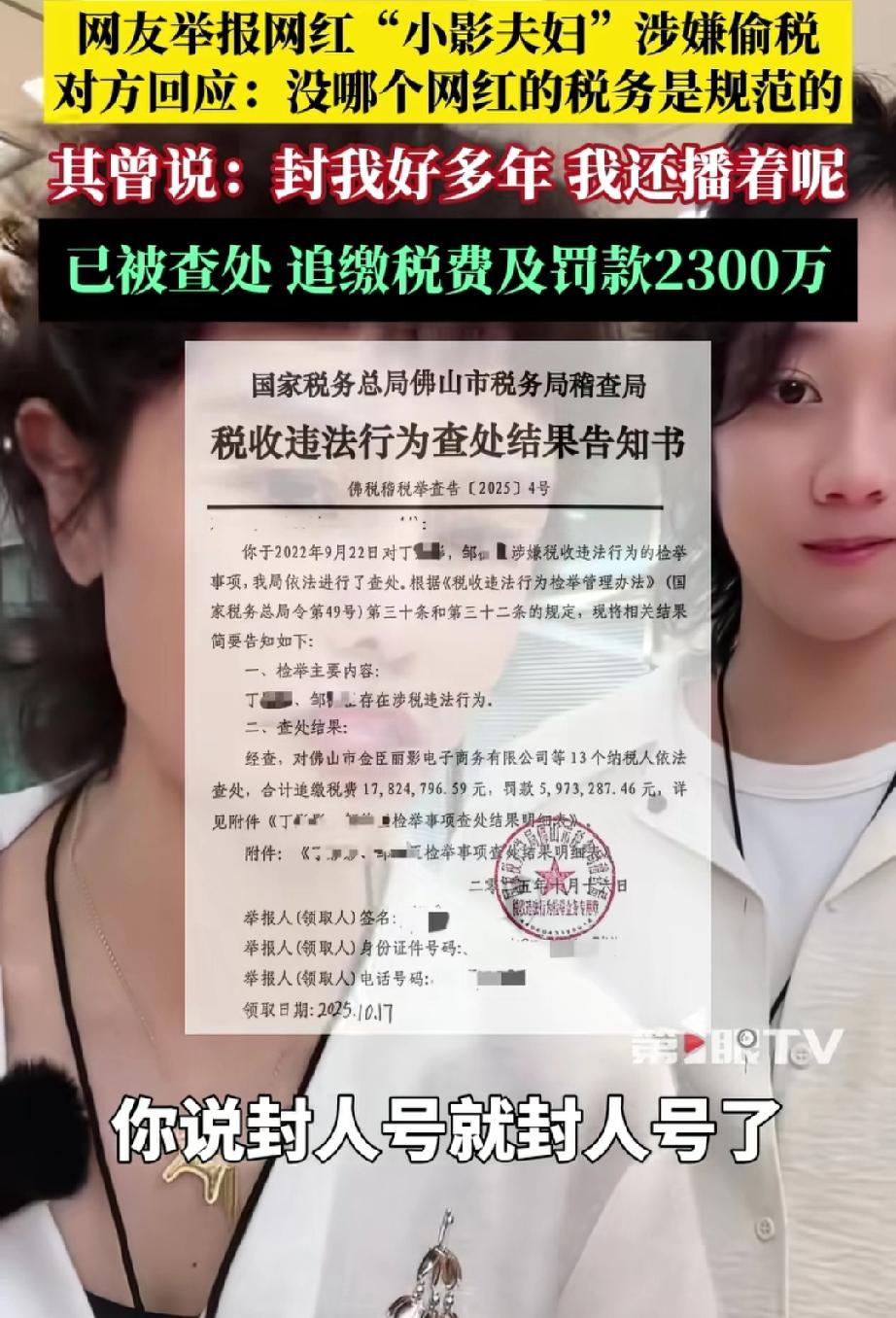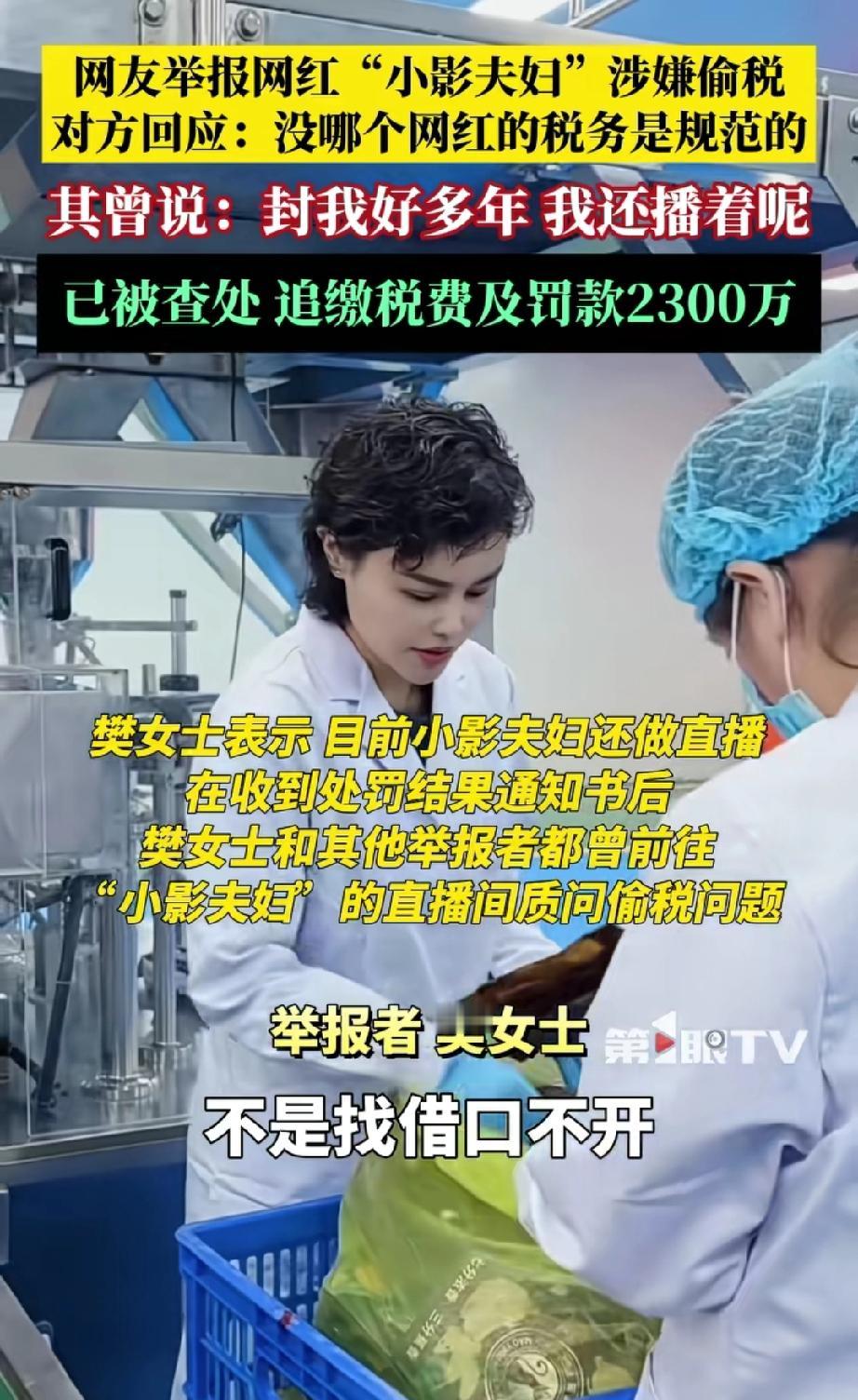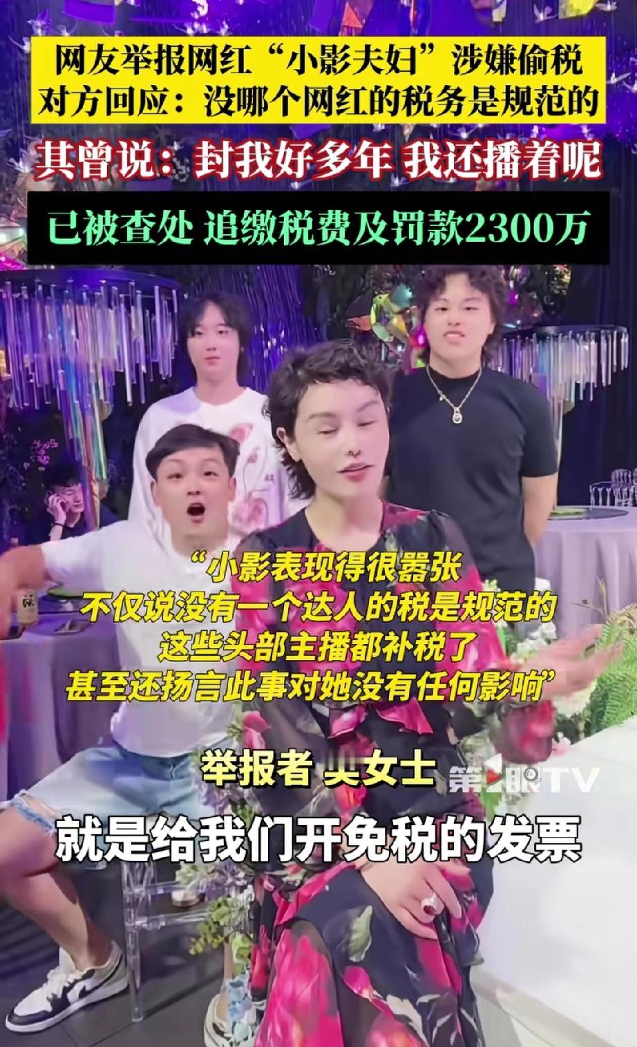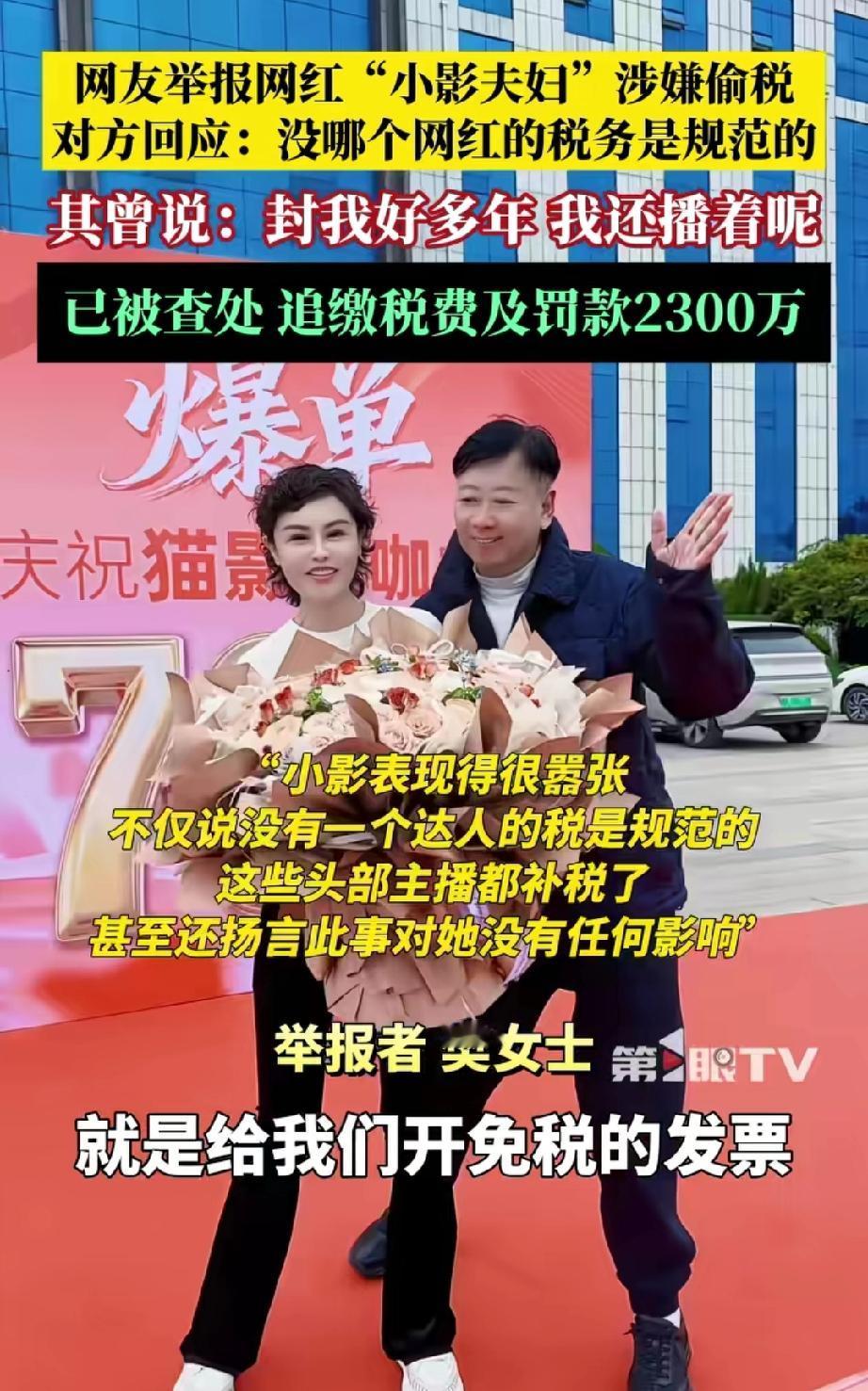 真是嚣张至极!网红“小影夫妻”遭网友举报偷税漏税,查证后被追缴税款1700多万,还被处以590万罚款。 有网友在其直播时发问:“你的直播间咋还没封啊?” 小影回怼道:“你说封就封啊,都说要封我好多年了,我还播着呢,哪个达人的税款规范了?这事对我没什么影响。” 小影是安徽人,经历过三次婚姻,目前的丈夫是邹德臣,两个人在2021年生下宝宝,在给宝宝办满月酒时直播带货金额达到3000多万。 有网友透露:“在她直播间购物时,让她开发票,要么不开,要么就给一张免税发票。” 而她的直播间,卖的很多都是本土产品,怎么会有免税发票呢? 小影夫妻坐拥930多万粉丝。在10.17日收到合计2300万的补税款加罚款通知。 目前尚不清楚他们是否已补缴款项,直播仍在继续。难道不该补交税款后才能继续直播吗? 我想,小影夫妻应该是补足了税款,才会有嚣张的底气。 当然,小影回应中有句话没错:“网红的税务大部分不规范。” 这句话或许会激怒其他网红,给自己带来麻烦。 当下的很多网红,享受到早期的网络红利,赚的盆满钵满。他们大多文化程度较低,根本不把交税的事放在心头。 也有的因人设崩塌,或是健康问题,一个接一个的消失。 纳税是公民不可推卸的责任和法定义务,每一分税款都为民生福祉筑牢根基——从街巷路灯到医疗教育,从交通基建到养老保障,皆源于这份无声的担当。 来源:第1眼新闻