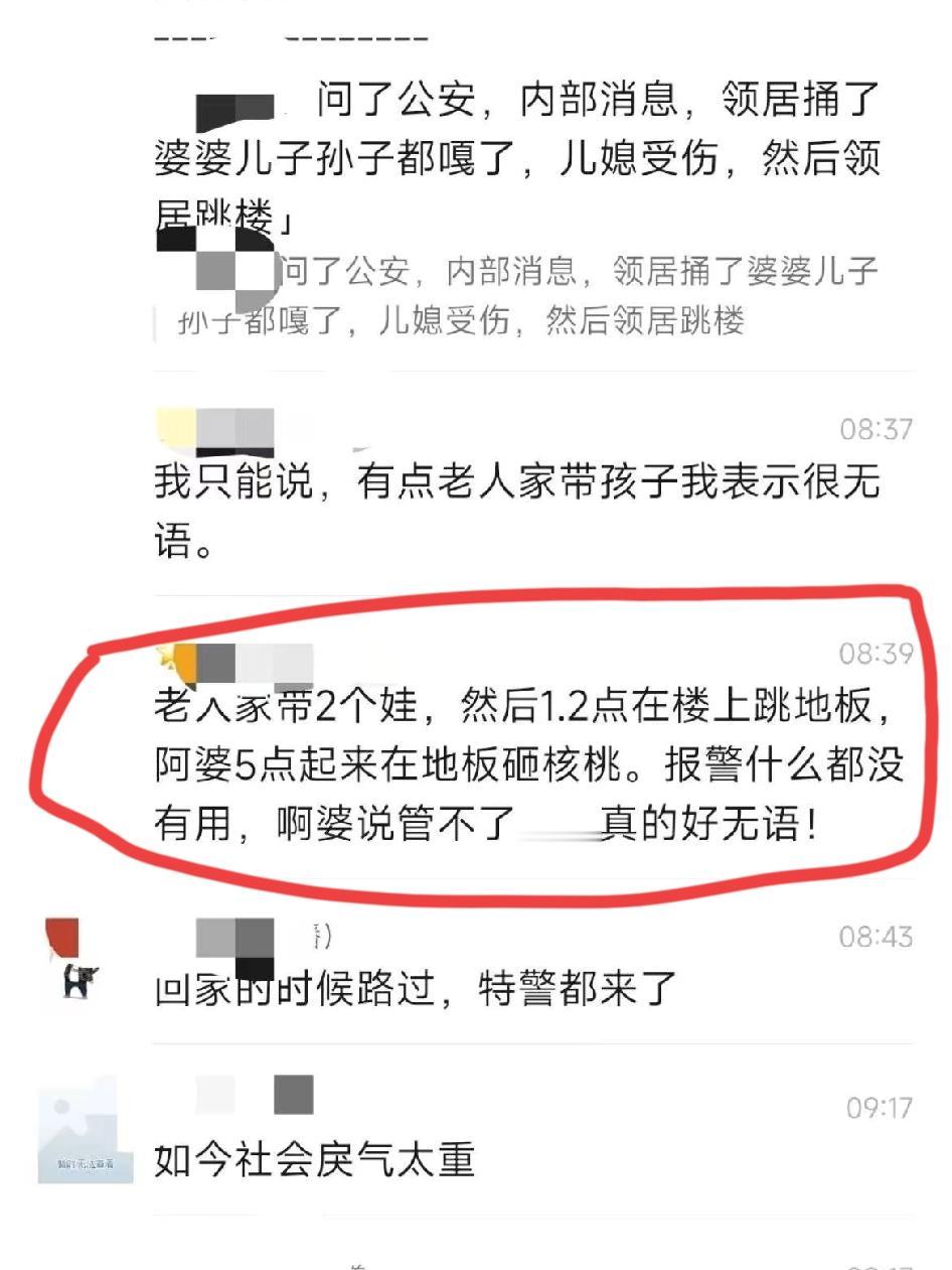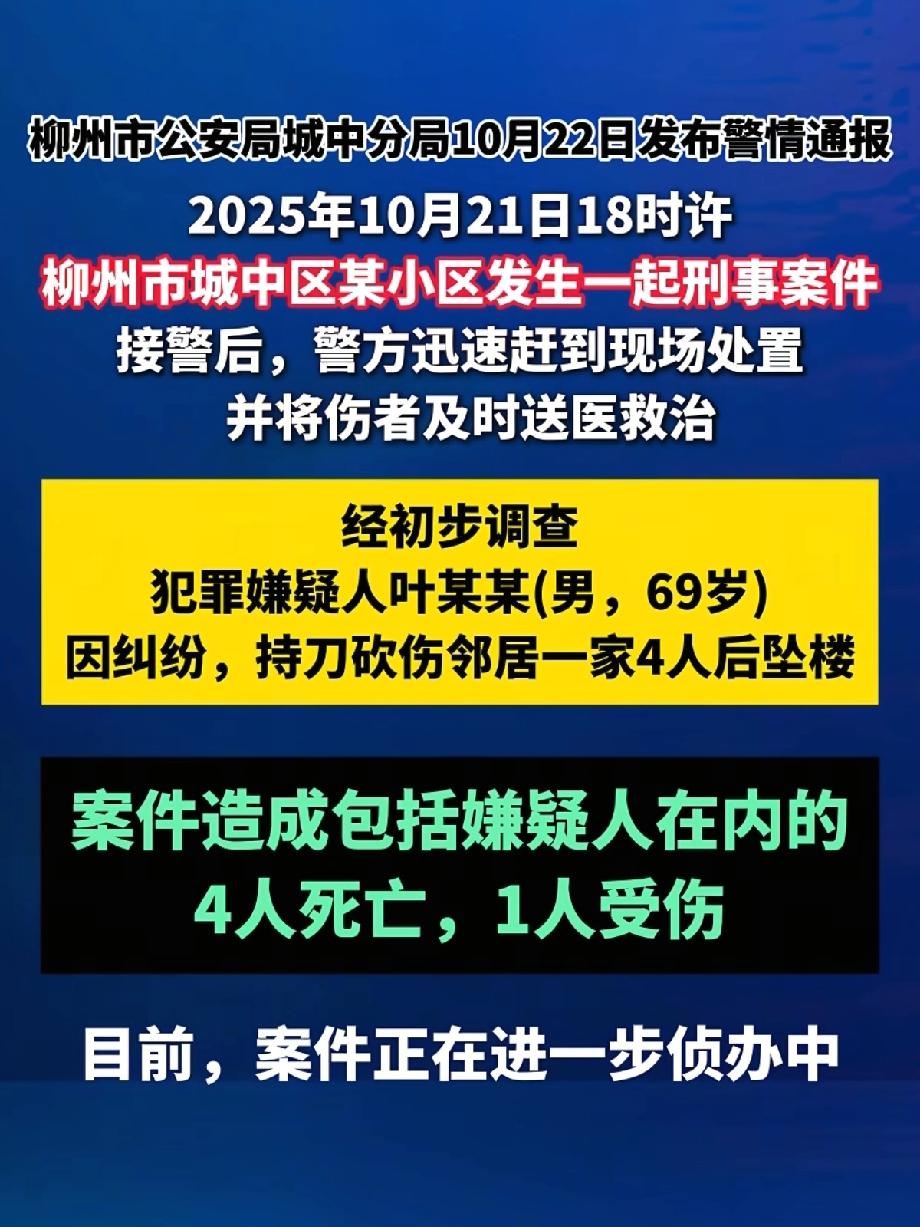 太揪心了!都说远亲不如近邻,可是21号当天,广西柳州某一个小区发生了一个惨案,一名69岁的老人,拿刀砍邻居一家四口之后自己坠楼,导致四死一伤! 警方报道只是说因为纠纷导致这样的惨剧,而下面评论中有网友说,是因为这一家子经常制造噪音,也不知道是上下楼,还是对门,这样弄噪音已经很多年乐,中间也曾经报警,但劝告斗无效,看样子是冰冻三尺非一日之寒啊! 如果真是这个原因,真不知道该批判谁,因为有因就有果,只想说退一步海阔天空! 这个大岁数本是该好好享受安稳日子,没想到是这样的纠纷困扰这么多年,这是攒了多少怨气才变成今天的仇! 人呐,别太过分,凡事都有两面性,做什么都得考虑后果,做人还是要善良一点,为别人考虑也是在为自己安稳做保障,大家说是不是? 柳州悲剧 老人坠楼 小区邻居那些事