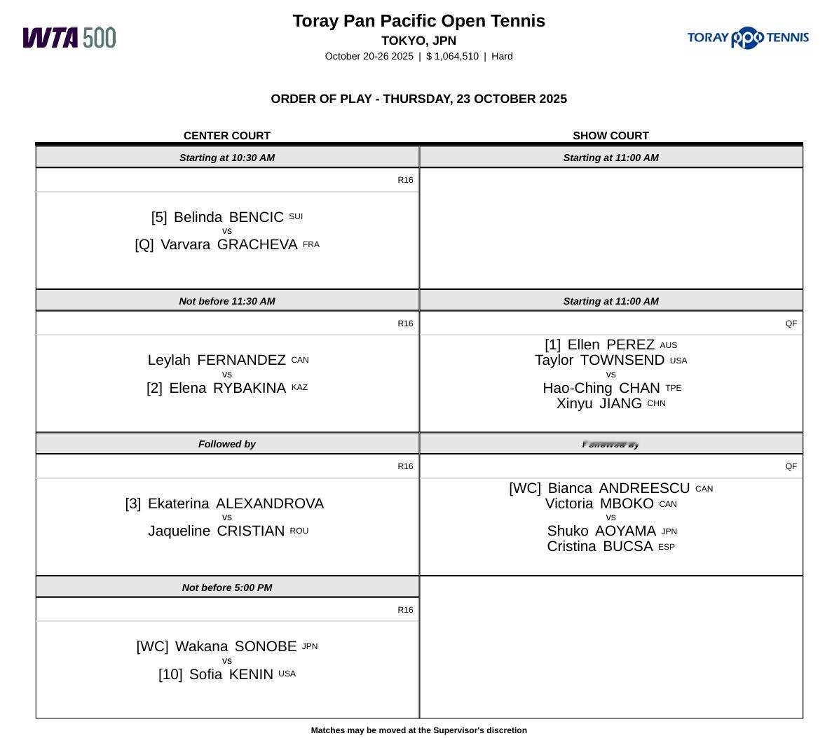 广州站第二轮全面开打,王雅繁、王曦雨和张帅出战。东京站莱巴金娜对决费尔南德斯,本西奇、亚历山德洛娃、肯宁亮相。