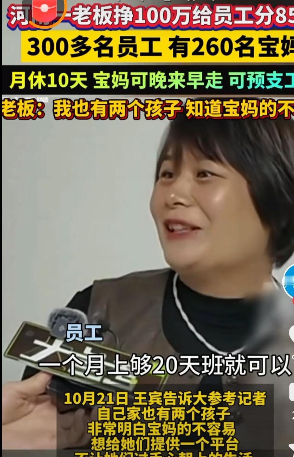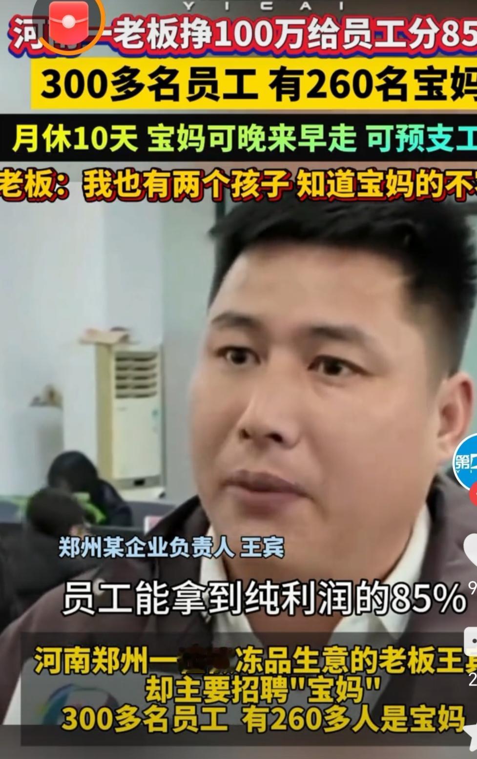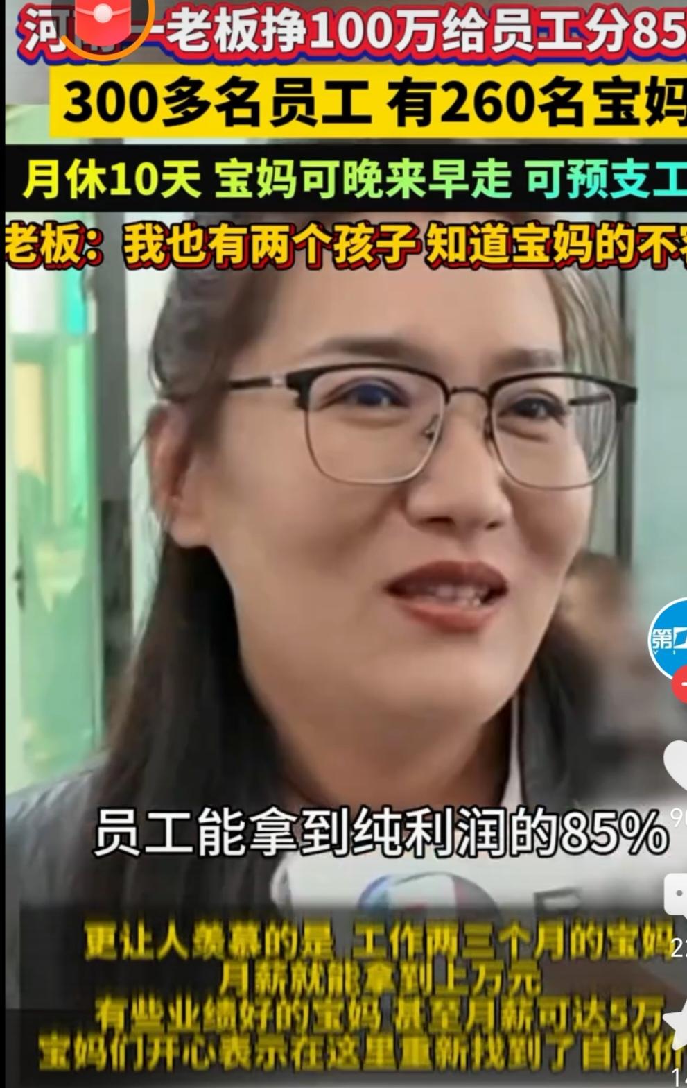 河南一老板挣100万给员工分85万,300多名员工有260名宝妈,月休10天宝妈可晚来早走可预支工资,老板: 我也有两个孩子知道宝妈的不容易...... 在这个快节奏、竞争激烈的社会,很多企业的员工福利都停留在“表面文章”上,但河南这位老板用实际行动,彻底颠覆了我们对“企业关怀”的认知。你是否曾遇到过那些只会在节假日发个祝福、年终发个红包,却从未真正走进员工心里的企业?而这位老板,却用一份“真情实意”告诉我们:关心员工,就是关心企业的未来。 事情的起因很简单——这家企业去年挣了100万,老板决定将其中的85万分给员工。这份慷慨,背后不仅仅是数字的堆砌,更是一份对员工的尊重和信任。而令人感动的是,这些员工中,有超过260位是宝妈——她们为了家庭和事业,选择在这里奋斗。老板不仅理解她们的难处,还为她们提供了“弹性工作”——月休10天,允许宝妈们可以晚来早走,甚至可以预支工资。 这是不是让你心里一震?在这个时代,企业的责任似乎只停留在利润上,但这家企业用行动告诉我们,真正的企业家精神,是懂得照顾那些为企业付出汗水和泪水的“家庭成员”。老板说:“我也有两个孩子,知道宝妈们的不容易,所以尽可能给予她们最大的理解和支持。”这句话简简单单,却让无数读者心头一暖。 或许有人会说,这只是个别现象,毕竟“善待员工”听起来总像是企业的“噱头”。但事实证明,善意和理解,能带来多大的改变?这家企业的员工们不仅工作更有动力,团队的凝聚力也前所未有的增强。其实,企业的未来,从来都不是只靠盈利堆砌出来的,而是靠“关心”筑起的坚实根基。 更令人深思的是,这样的企业文化,能够激发出怎样的社会正能量?当我们看到“老板为宝妈们提供弹性工作、预支工资”的时候,是否也在反思自己所在的环境?我们是否也可以在自己的岗位上,给予身边人更多的理解和支持? 这不仅仅是一则关于“企业分红”和“员工福利”的新闻,更是一次关于“人性关怀”的深刻启迪。在这个快节奏的时代,让我们都试着用一颗温暖的心去看待身边的每一个人。也许,一个微笑、一句理解,就能点亮他人的生活,也让我们自己变得更加有温度。 这家河南企业的故事,还在继续。它告诉我们:善待员工,不只是责任,更是一种智慧。让我们以他们为榜样,把这份温暖传递下去——因为,真正的企业,最终是由一颗颗温暖的心组成的。河南老板100万给员工85万 大爱
