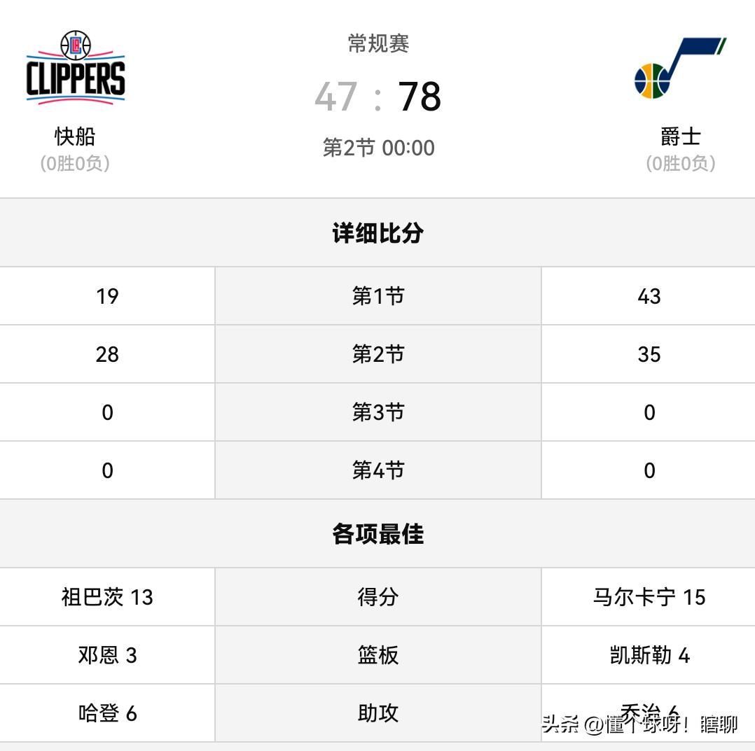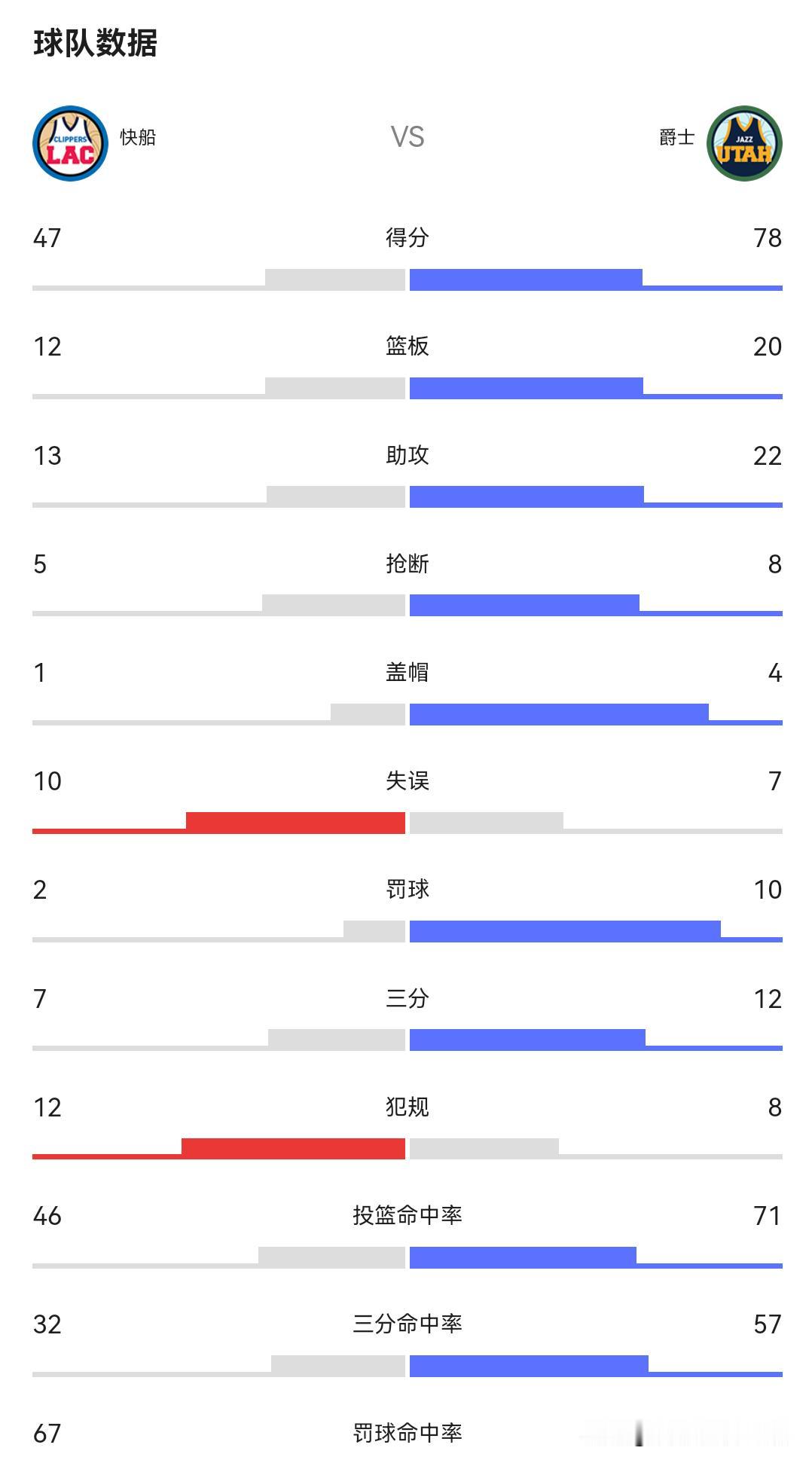 快船这是打的什么玩意,本以为是虐菜局,不过是反过来了,快船被虐的体无完肤 第一节就落后24分,半场快船就落后31分,看来第一节,快船就各种莫名失误,各种漏人,那防守形同虚设 小卡完全就是梦游的状态,没有防守,还传球失误 再看看爵士球员,个个都打成全明星,那叫一个准,各种快攻暴扣,各种三分,怎么投怎么有 57%的三分命中率,投篮命中率72%,这就是在投篮训练啊