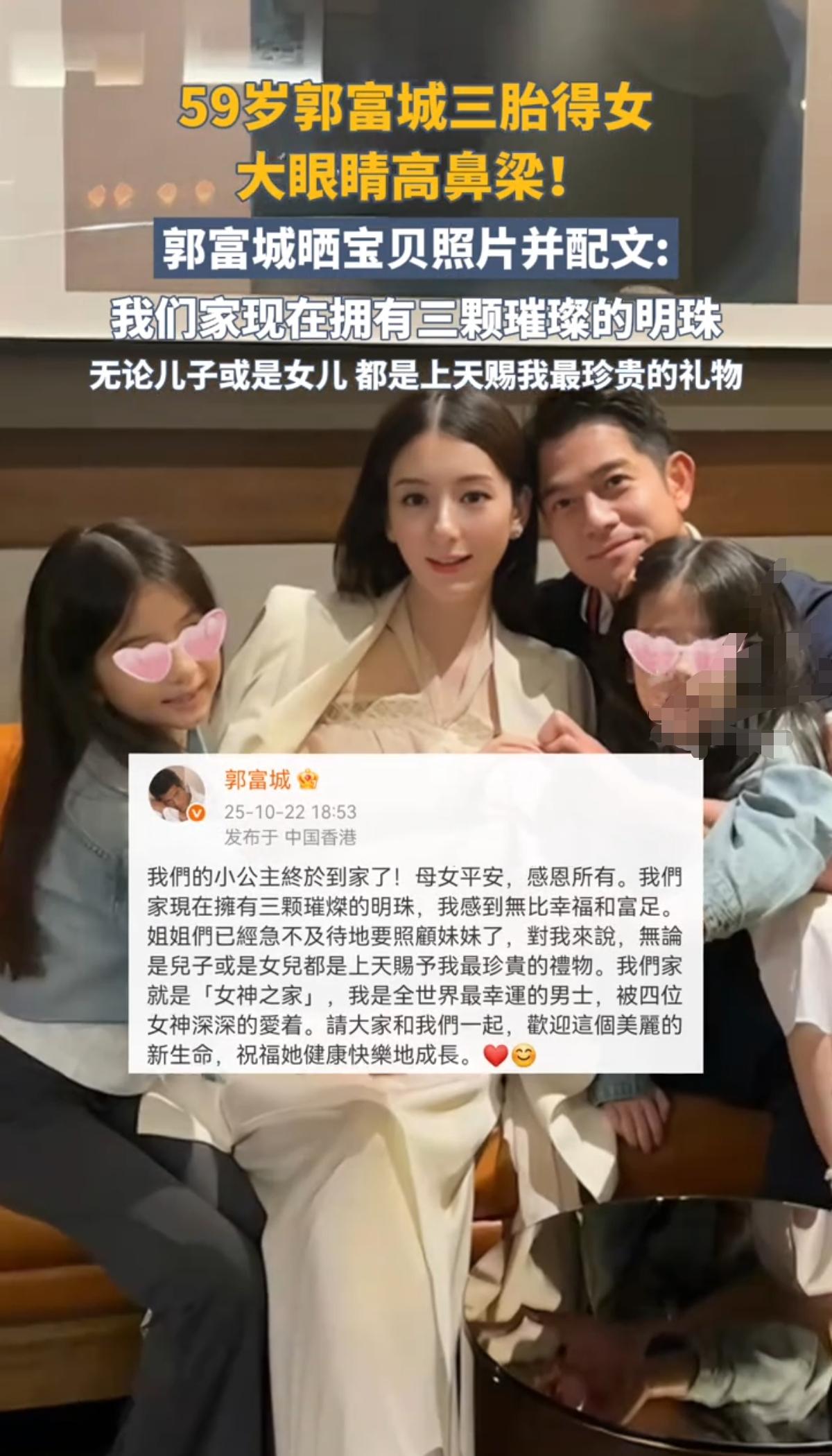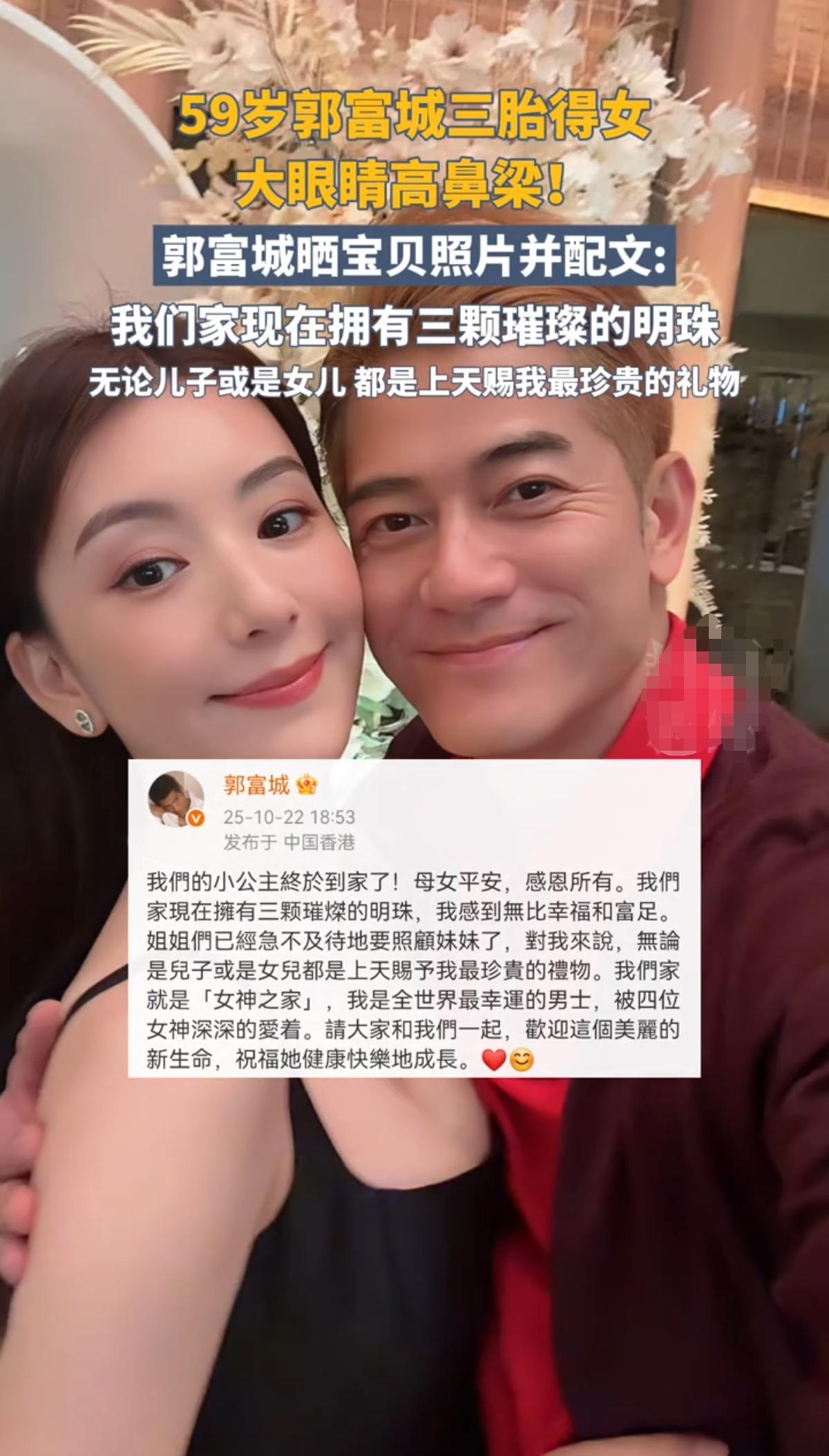天啊! 真的是福星降临啊,出生面相也太好看了吧 59岁郭富城三胎得女。外界猜测了这么久的性别,原来是女孩子,郭富城晒照片并配文:“我们的小公主终于到家了!母女平安,感恩所有。我们家现在拥有三颗璀璨的明珠,我感到无比幸福和富足。姐姐们已经迫不及待地要照顾妹妹了,对我来说,无论是儿子还是女儿都是上天赐予我最珍贵的礼物。我们家就是“女神之家”,我是全世界最幸运的男士,被四位女神深深的爱着。请大家和我们一起,欢迎这个美丽的新生命,祝福她健康快乐地成长。” 深深的被郭富城的生娃感言给暖心到了,好幸福的一家呀! 三胎女儿是真的漂亮呢,我从来没见过出生就这么漂亮,大眼睛,高鼻梁,天生自带福气的耳垂,真的是太好看了,出生就是个美人胚呢! 以后长大了一定是个大美人!你们觉得呢? 郭富城生三胎会带来哪些影响 郭富城三胎女儿