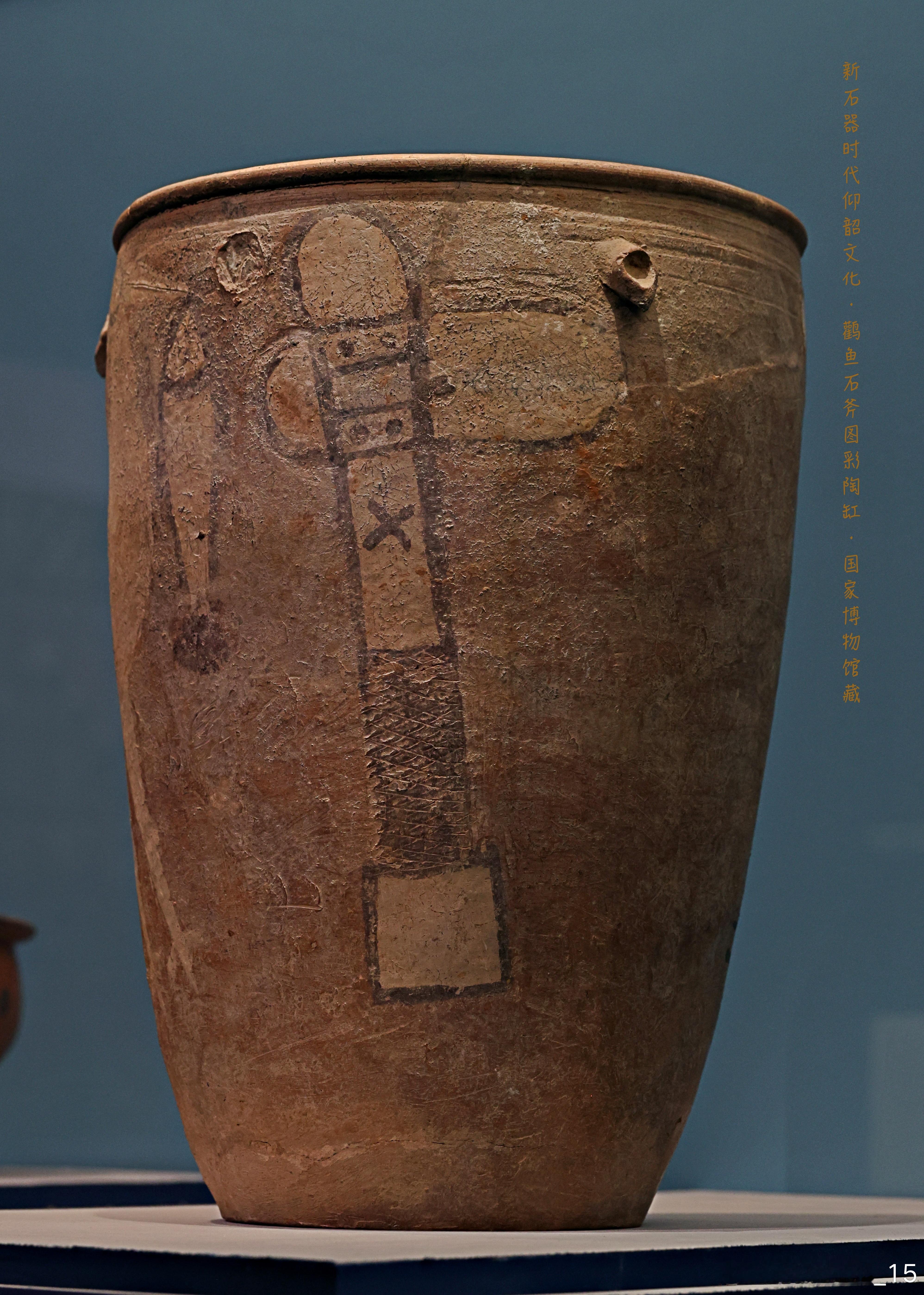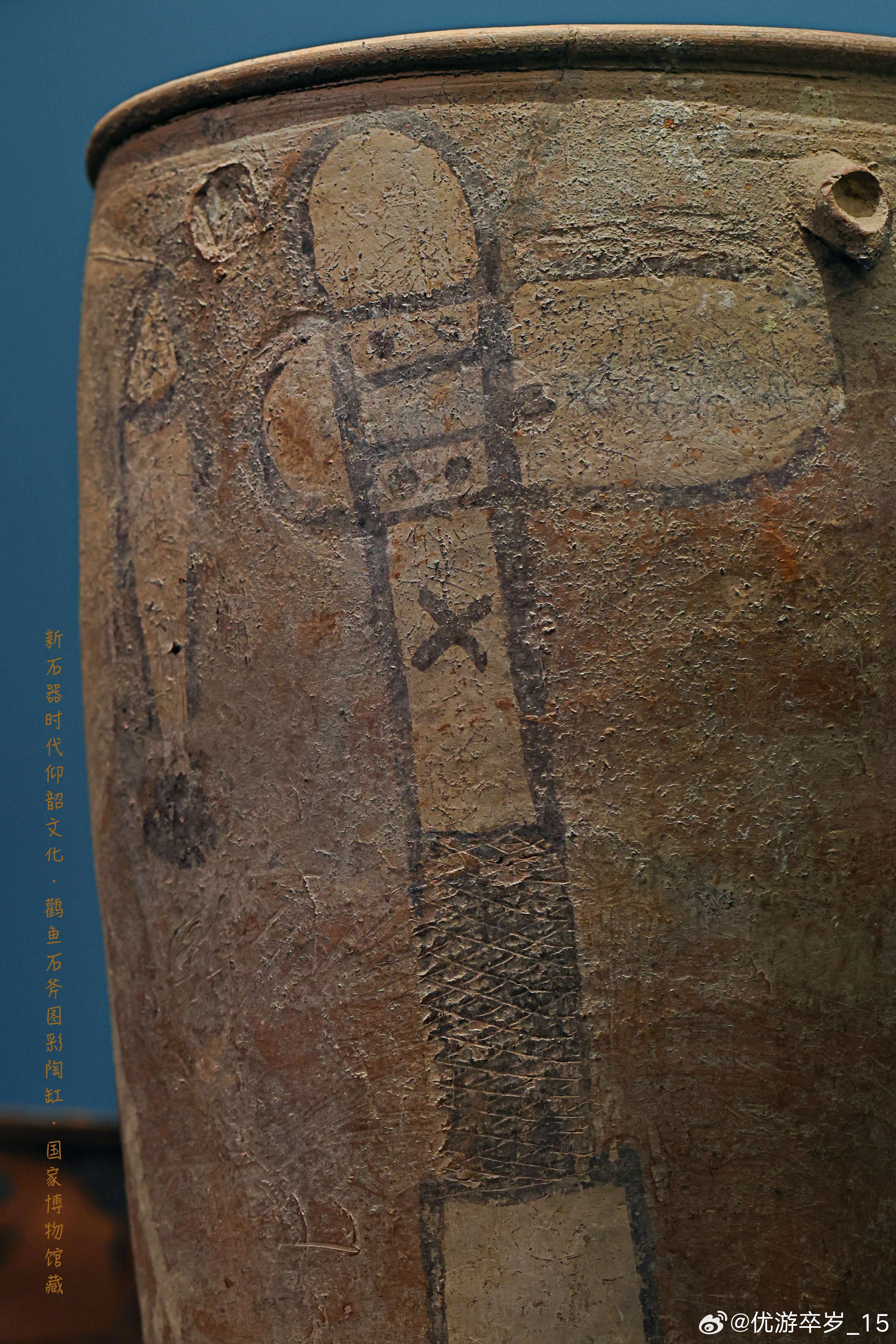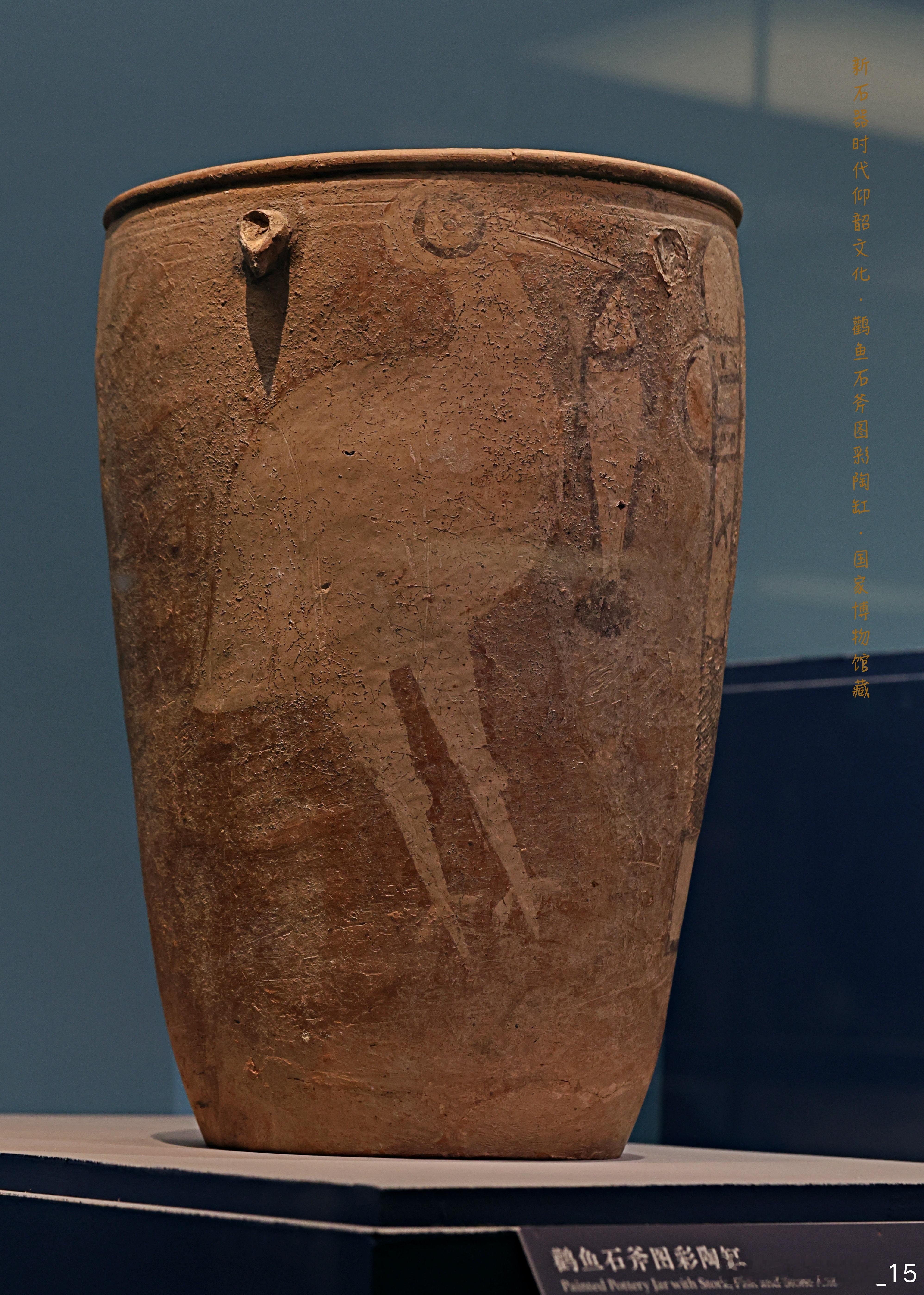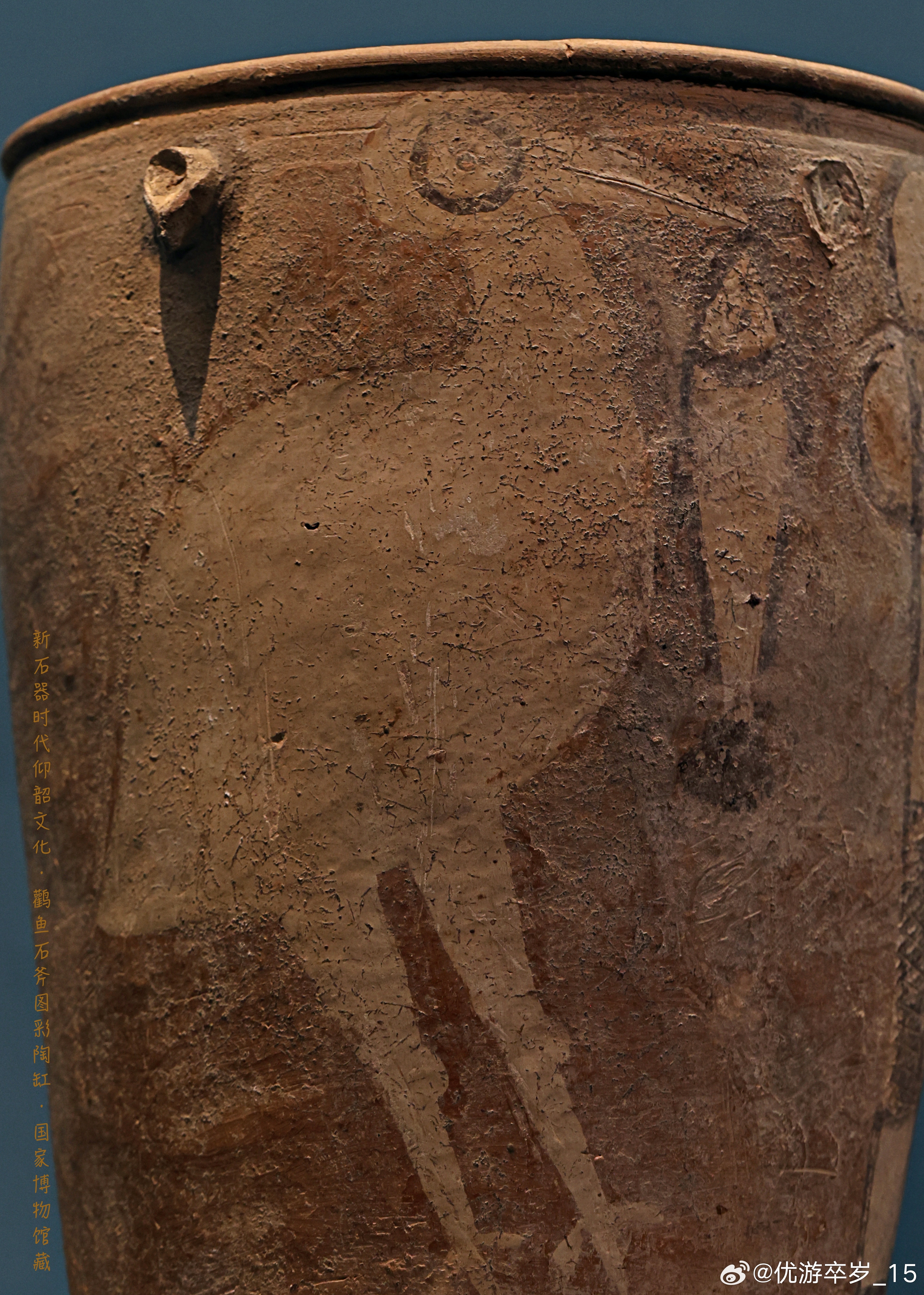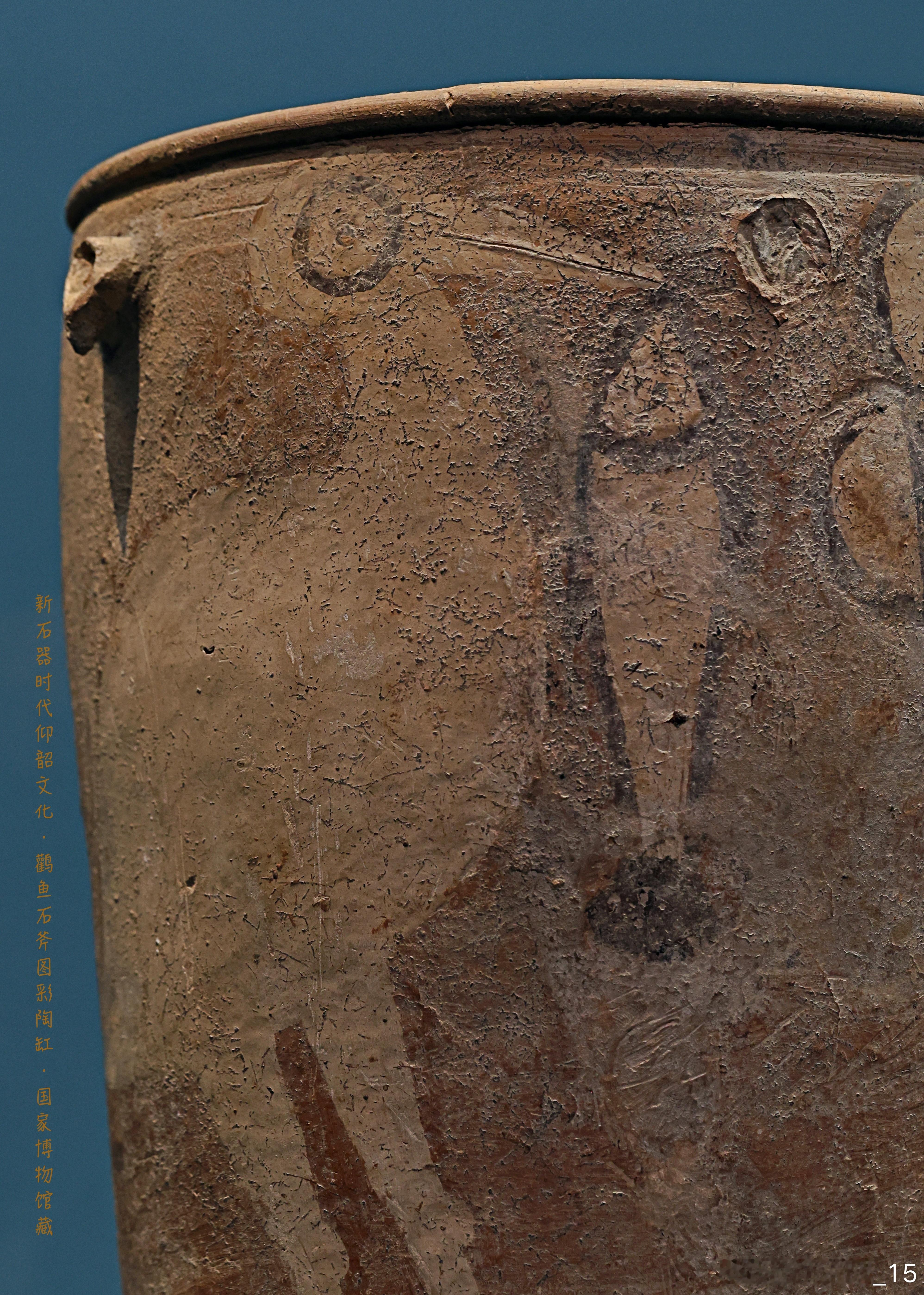 这件彩绘陶缸无论是矿物颜料的运用,还是鹳、鱼、斧的刻画都体现了仰韶文化成熟的彩绘工艺。更为可贵的是打破了以往仰韶文化彩陶以几何纹、动植物纹为主的格局,是中国绘画艺术从图案化向具象化发展的关键例证。