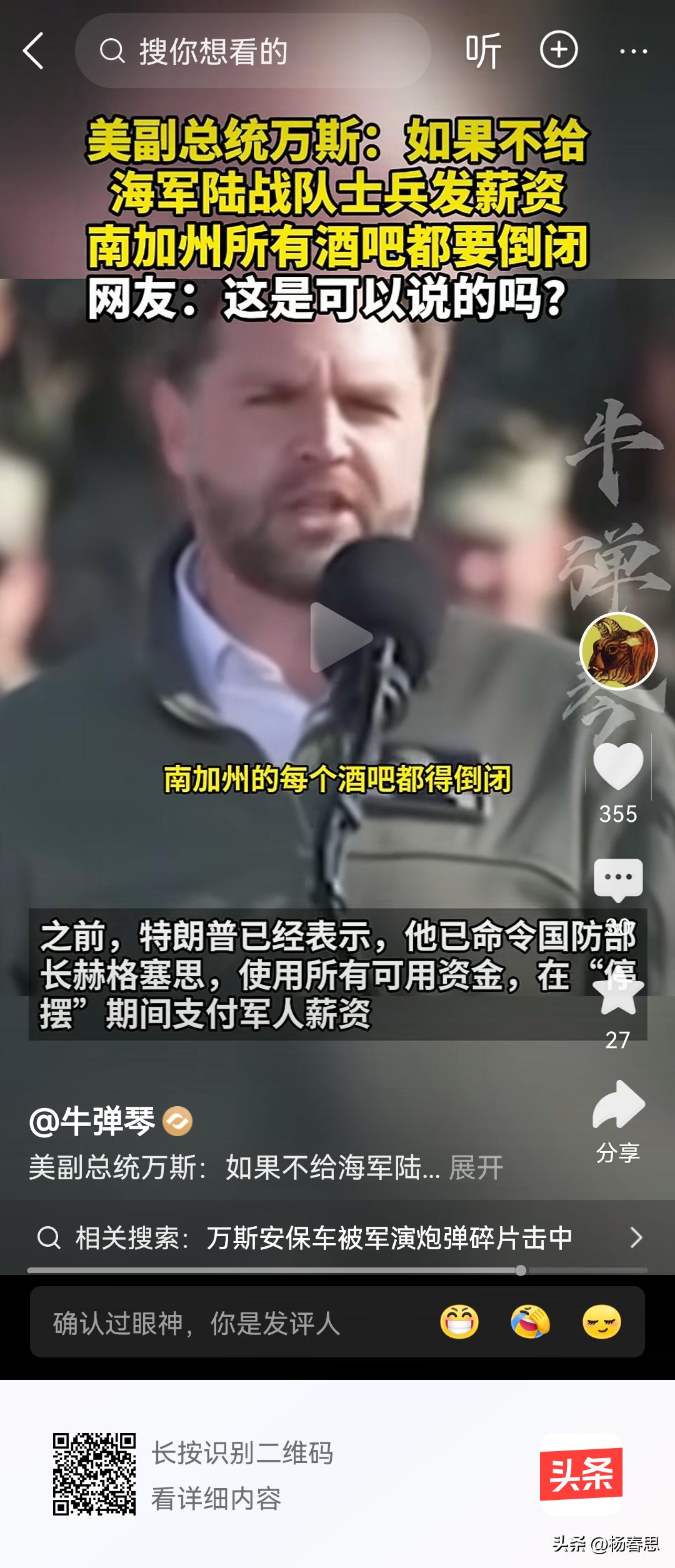 万斯口无遮拦地说如果不给海军陆战队发工资,南加州的所有酒吧都要倒闭,由此可见美国大兵真能喝呀,由此可见美国大兵生活多么腐败。怪不得他们长得那么肥胖,这样的军队有战斗力吗?这样的军队有纪律吗?这样的军纪这么松弛吗?[呲牙][捂脸][我想静静]