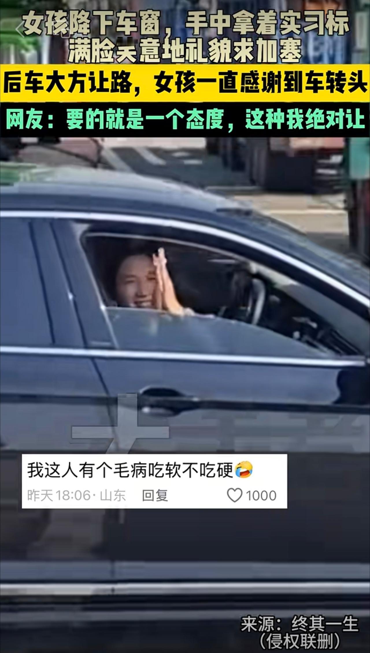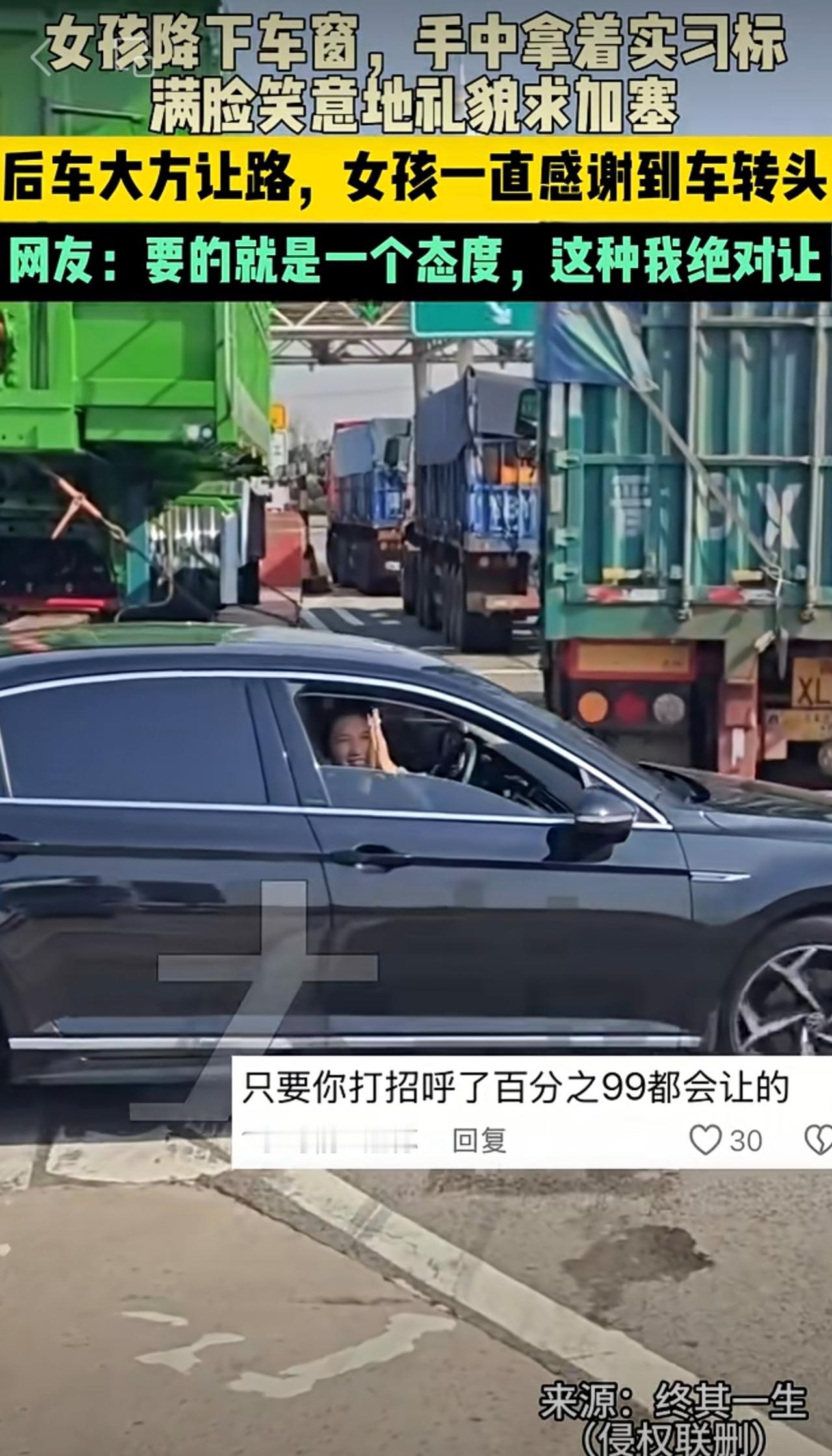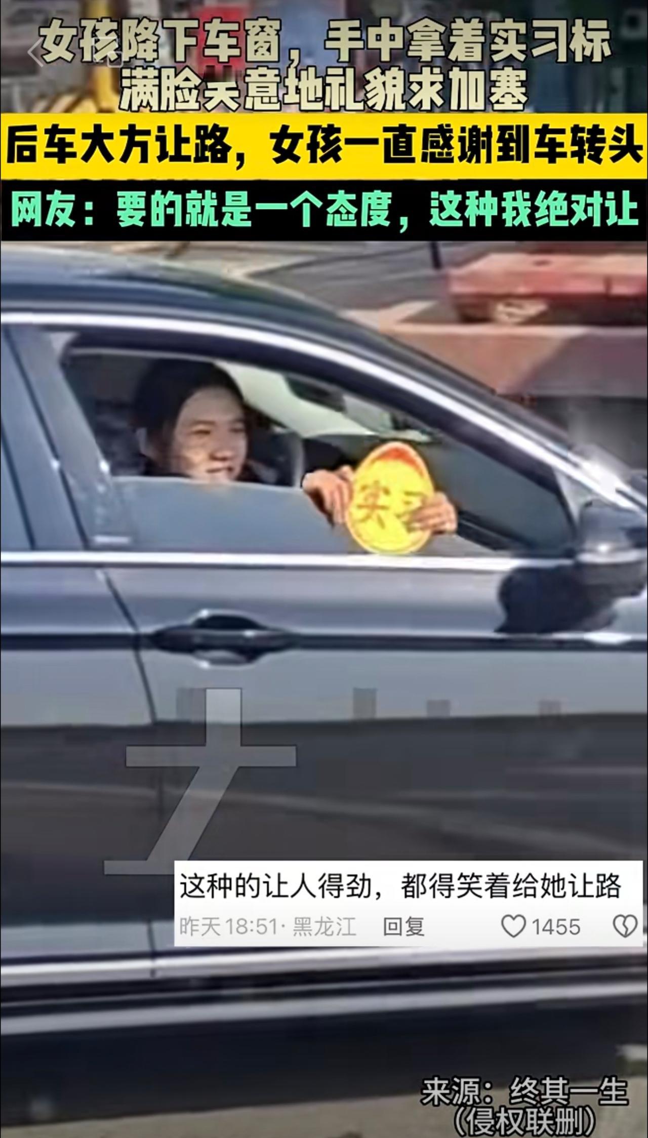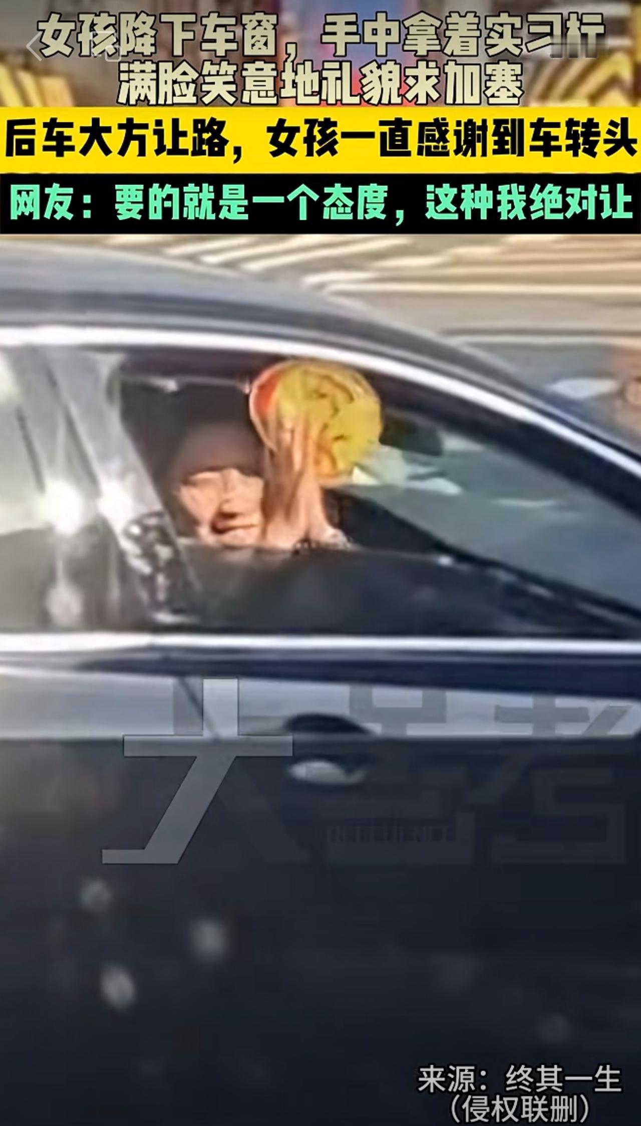 10月22日河北 (发布)女孩降下车窗,手中拿着实习标,满脸笑意地礼貌求加塞,后车大方让路,女孩一直感谢到车转头,网友:要的就是一个态度,这种我绝对让。