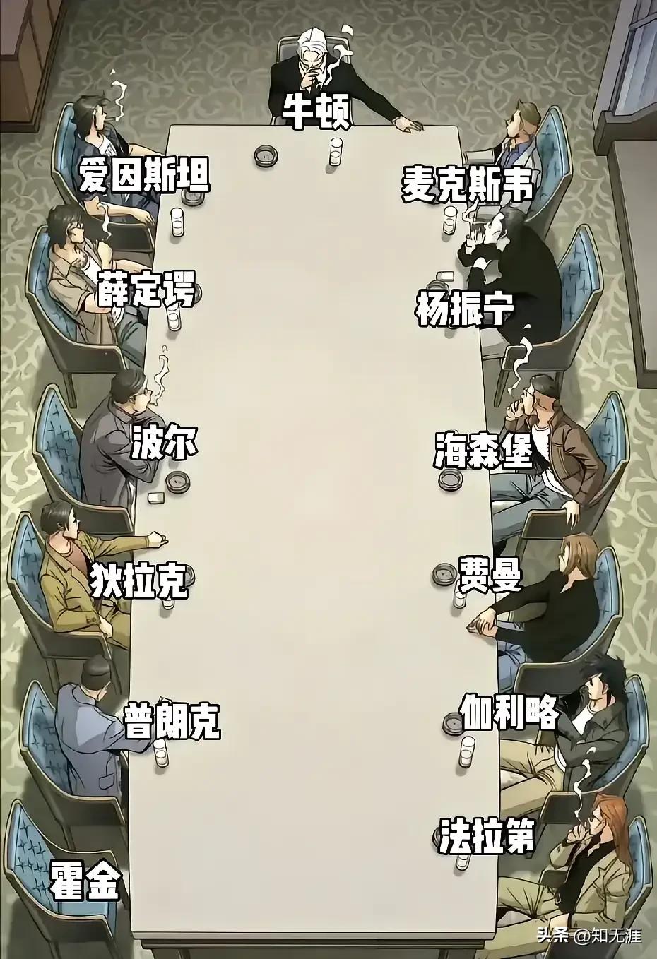 这是网友评选的人类历史上最伟大的十三大物理学家,有几个疑问: 1、牛顿跟爱因斯坦,到底谁才是坐桌子主位的那个人? 2、麦克斯韦有资格坐桌子右边第一个位子吗? 3、杨振宁坐右边桌子第二个位子,是不是有点不合理? 4、霍金能上桌吗?