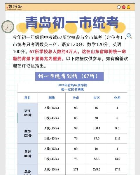 初一期中统考划线 = 中考入场券🔥 🔥 分数直接对标中考择校 冲2 中、58 中:至少前 15%(总分 288+),区排名前 8% 有机会、前 5% 稳冲! 进一类高中:前 35%(总分 275+) 上公办普高:前 50%(总分 258+);保底普高前 70%(总分 250+) 这是山东统一命题前的 “全市大摸底”,67 所强校超 4 万名考生参与,成绩直接反映孩的位置!现在知道娃的分数该往哪冲了吧? 青岛初中 初一期中 青岛升学 中考择校 青岛定位考