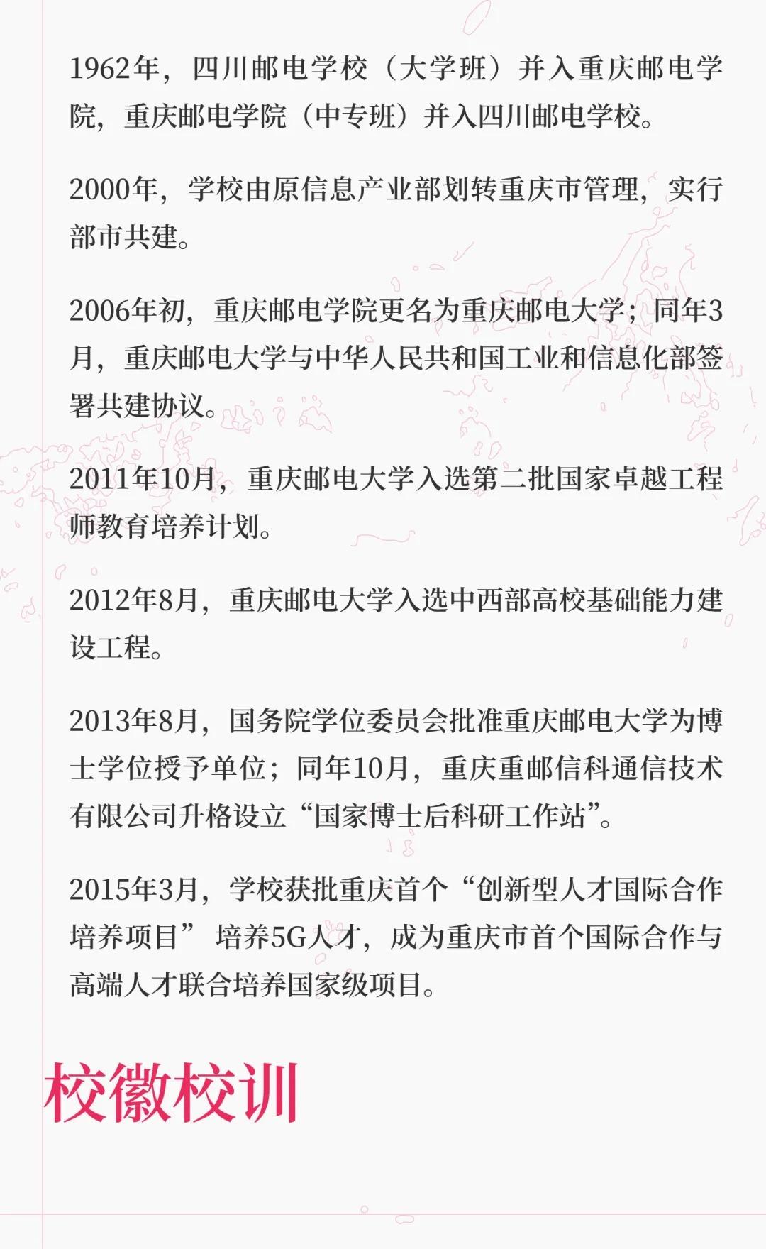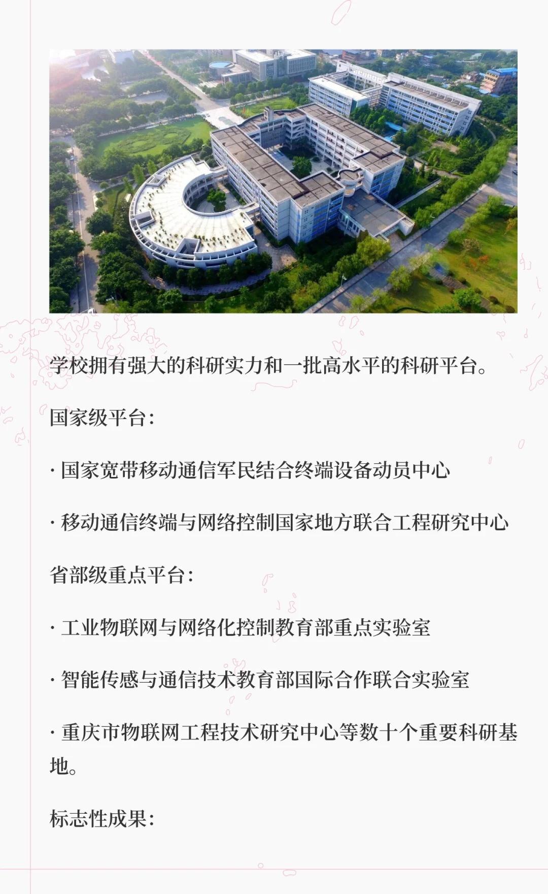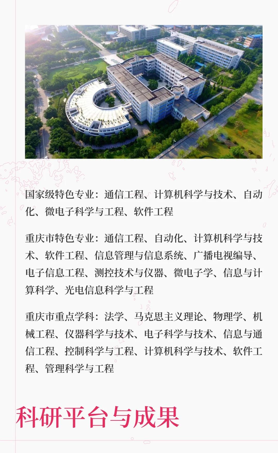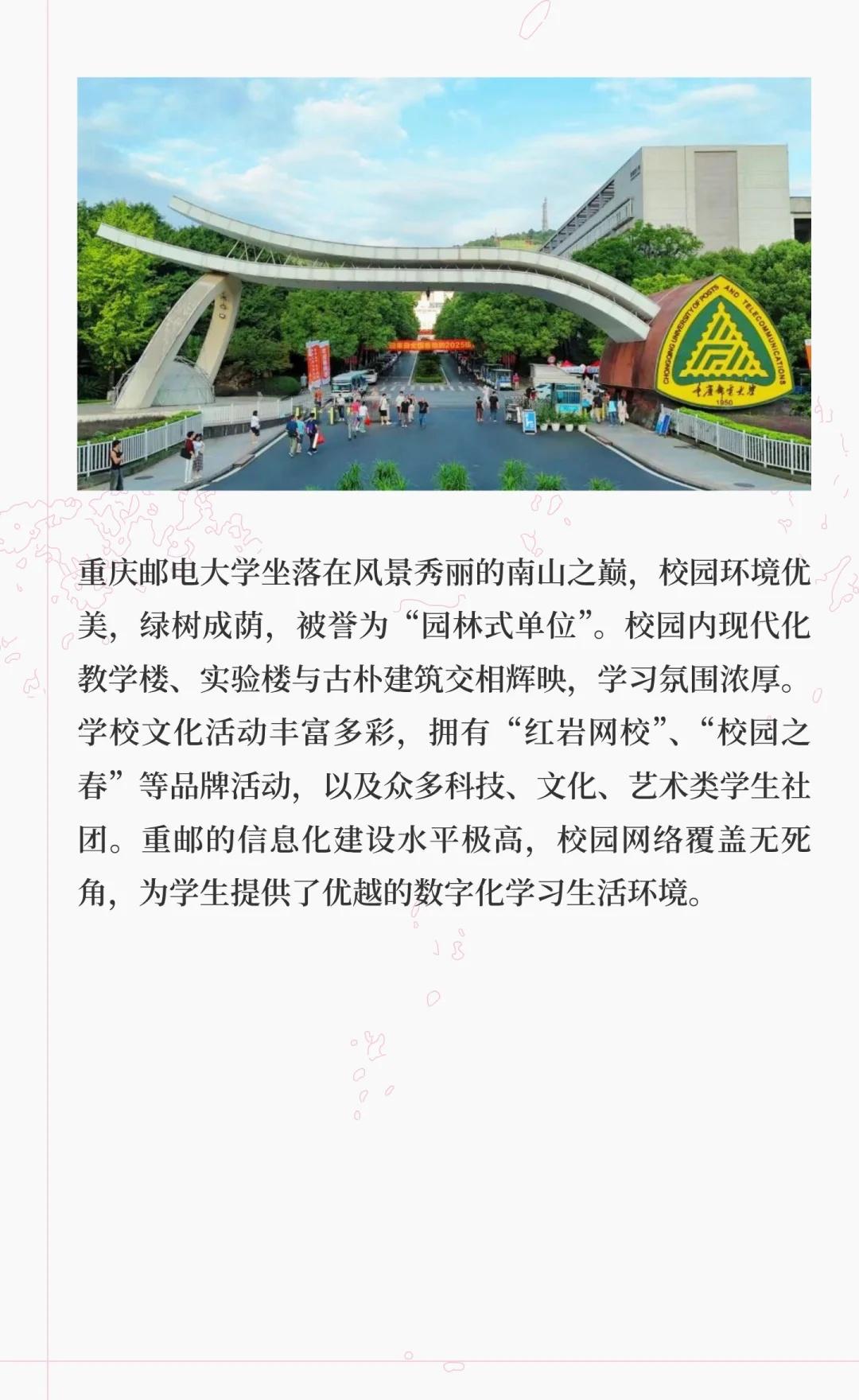 重庆邮电大学是信息通信领域的教学研究型大学,拥有多个国家级科研平台和特色专业,培养了大量IT行业人才,服务国家战略与地方经济,致力于建设高水平大学。高校 大学 院校规划 别人的大学 梦想的大学 我的高质量大学 欢迎报考 重庆邮电大学