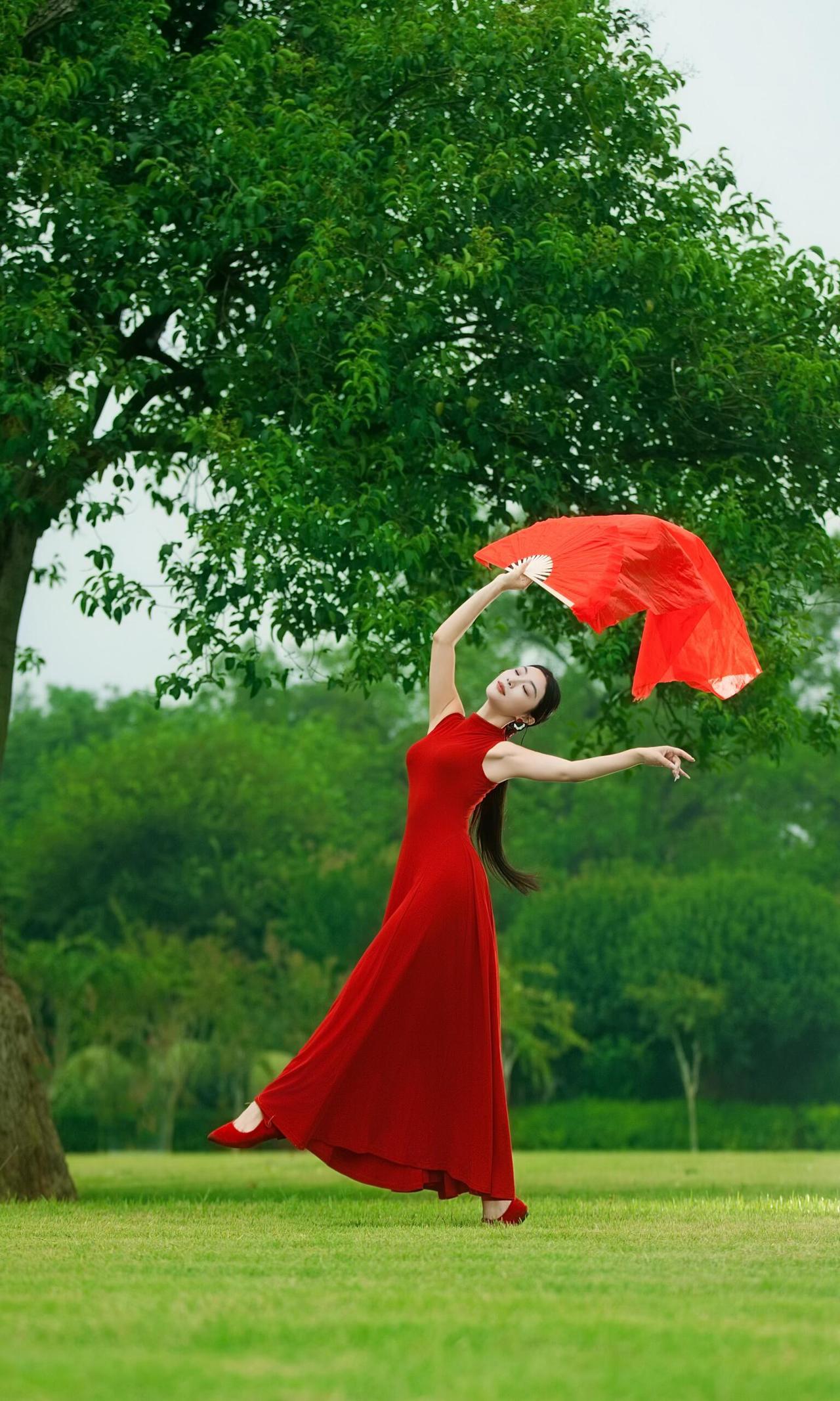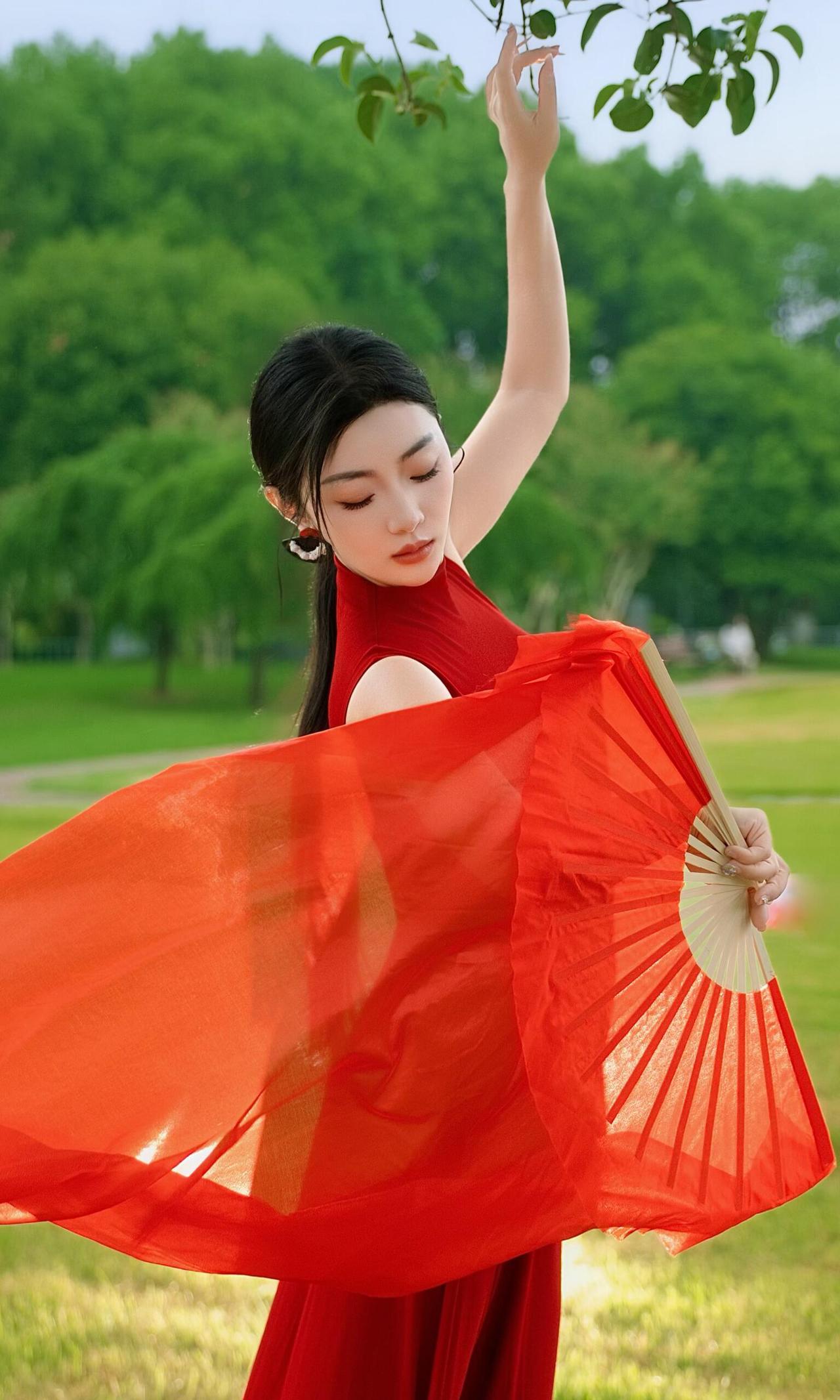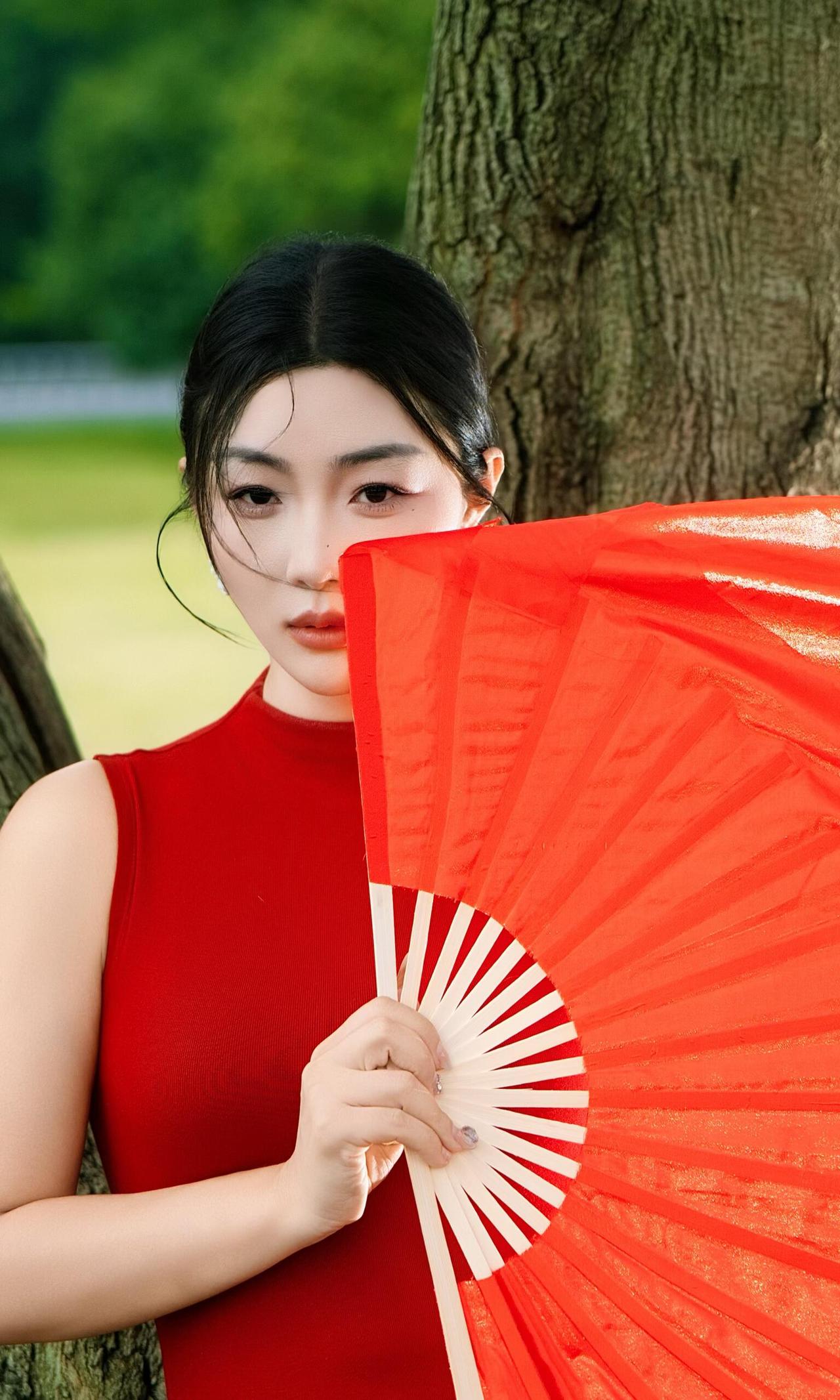 【红与绿】|人像摄影 当热烈红裙邂逅澄澈绿意, 便奏响了夏日最动人的乐章。 她执红绸扇于葱茏草地间翩跹, 那抹红是国风的炽烈, 那片绿是自然的呼吸, 一静一动,一浓一淡, 在镜头里碰撞出绝美的共振。 每一次扇影摇曳, 都是传统与现代的对话; 每一回裙角旋起, 都是生命与自然的相拥, 于红绿之间,写就独属于东方的浪漫诗行。 摄影技巧分享: ①拍摄时可利用红绿对比色强化视觉冲击,选择大光圈虚化背景突出人物。 ②捕捉动态瞬间时,建议用高速快门定格绸扇飞扬的丝滑质感。 ③静态构图可借助树木形成框架,让人物与自然环境互动。 ④光线选择柔和的侧逆光,既能勾勒红裙轮廓,又能让绿意更显层次,轻松拍出国风与自然交融的高级感。