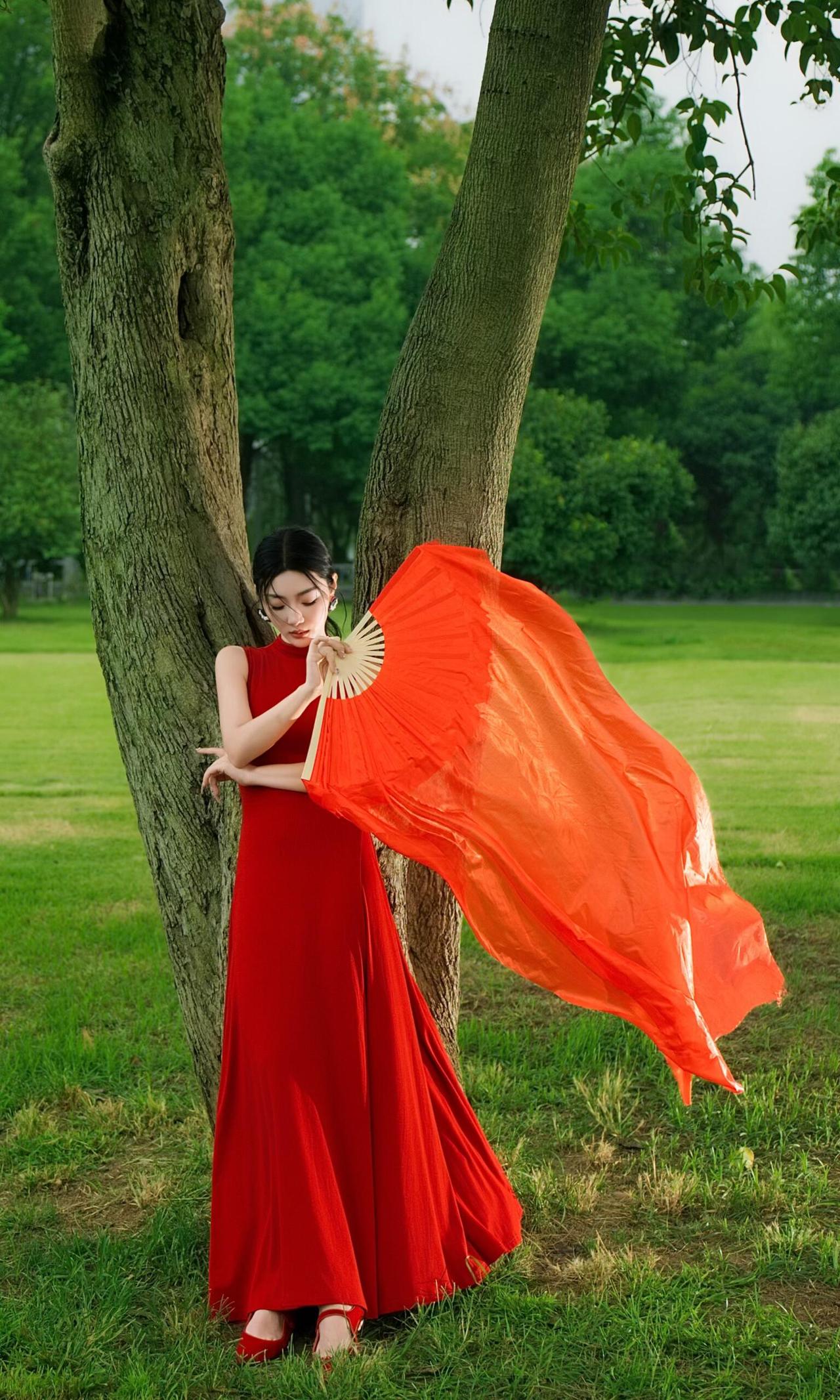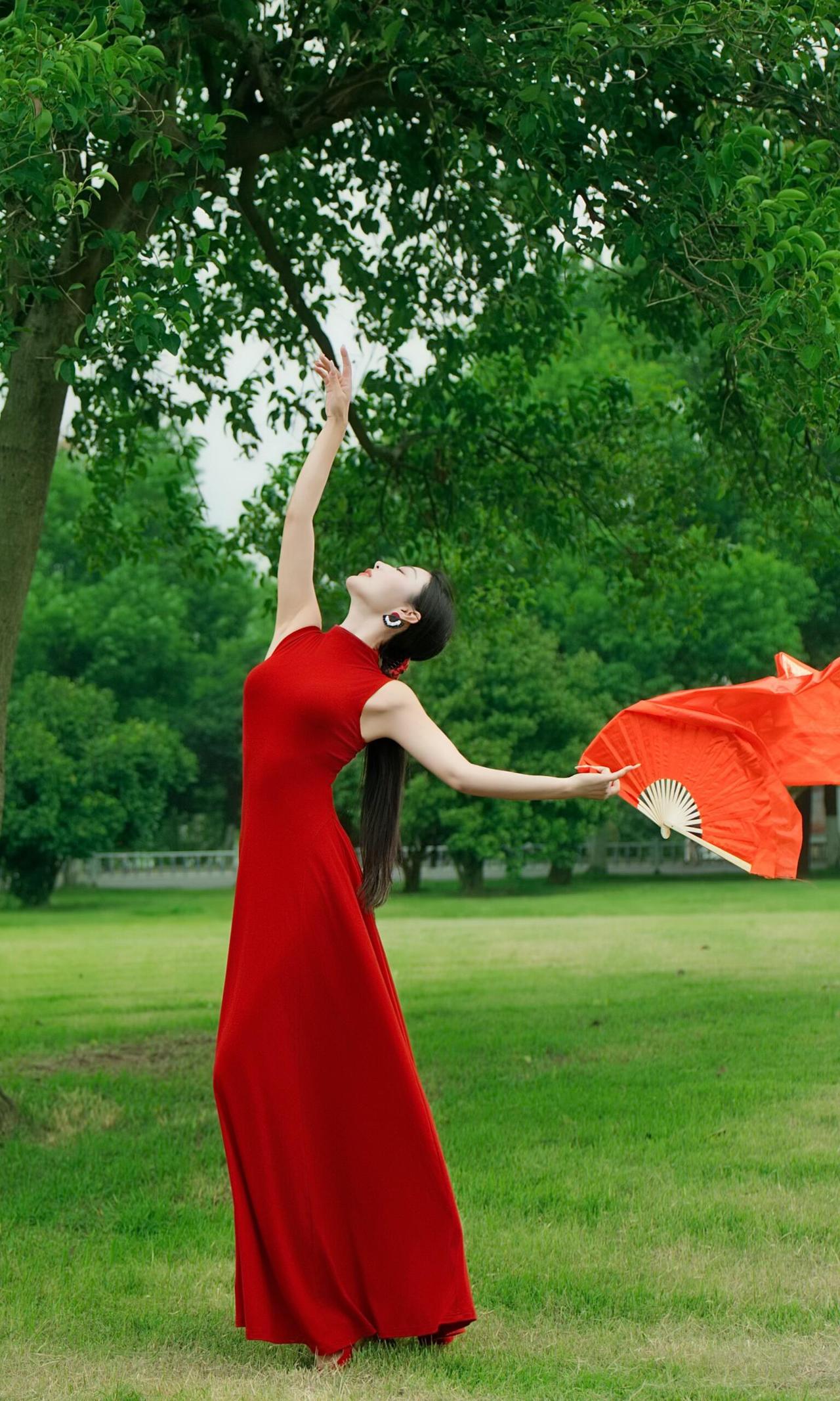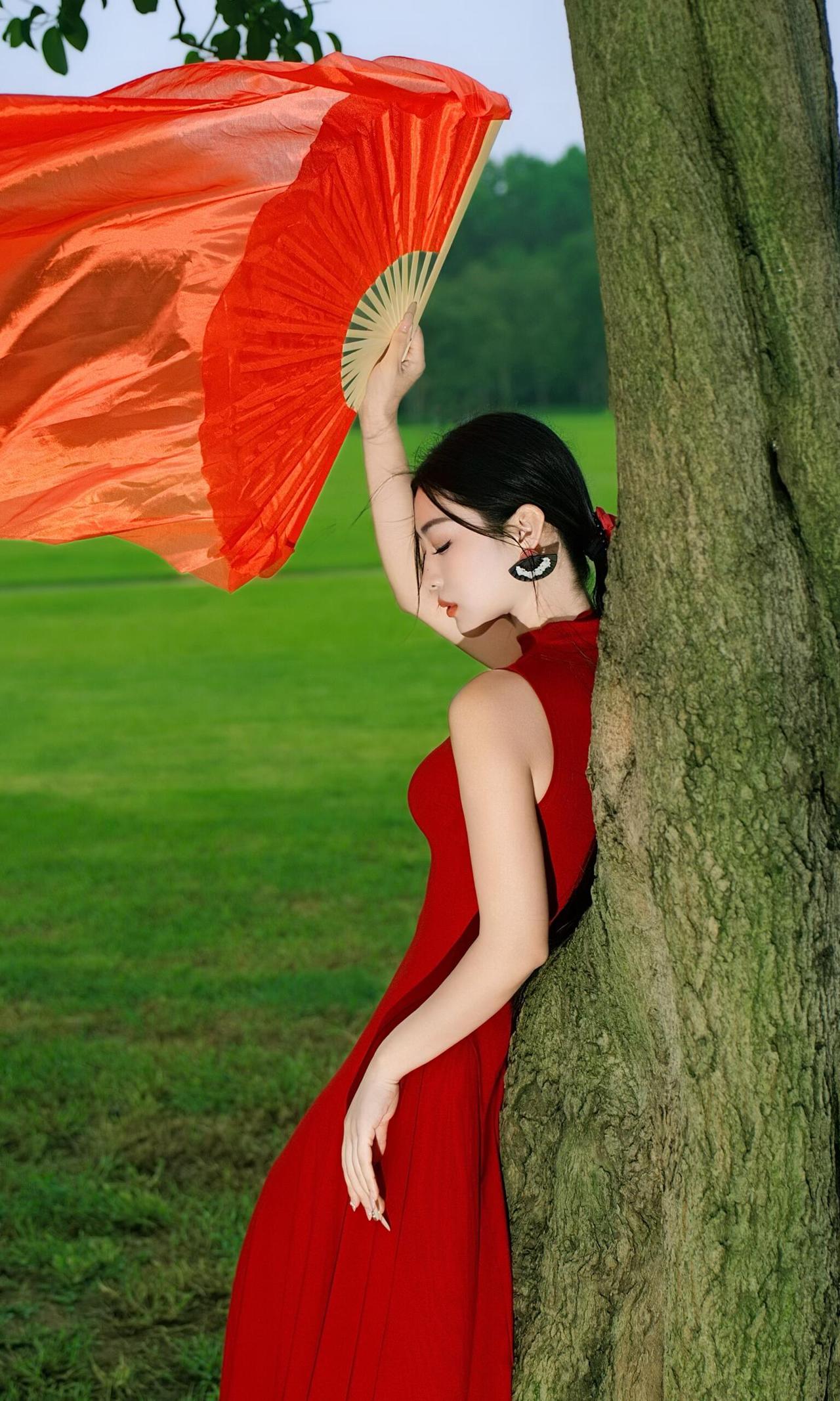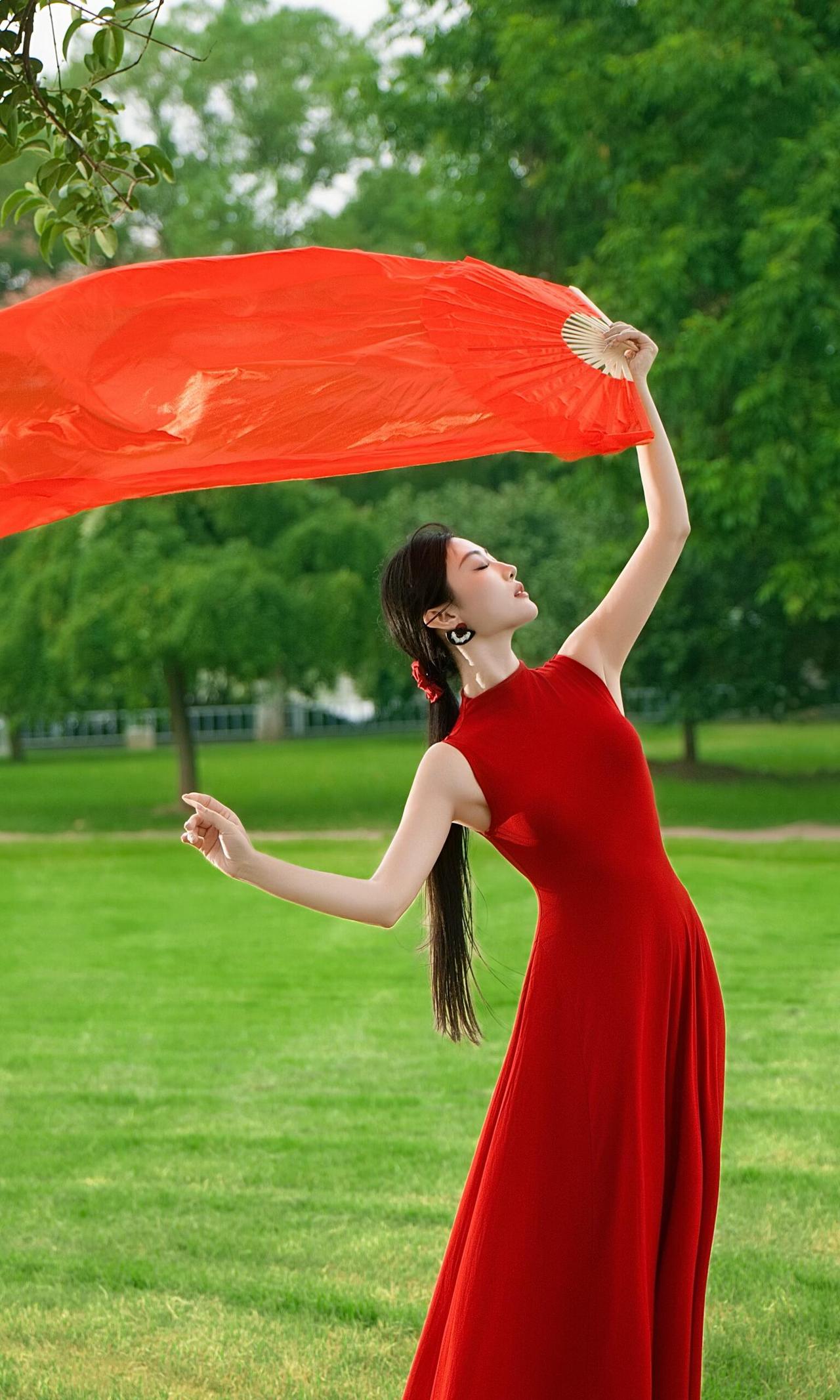 【红与绿】|人像摄影 当热烈红裙邂逅澄澈绿意, 便奏响了夏日最动人的乐章。 她执红绸扇于葱茏草地间翩跹, 那抹红是国风的炽烈, 那片绿是自然的呼吸, 一静一动,一浓一淡, 在镜头里碰撞出绝美的共振。 每一次扇影摇曳, 都是传统与现代的对话; 每一回裙角旋起, 都是生命与自然的相拥, 于红绿之间,写就独属于东方的浪漫诗行。 摄影技巧分享: ①拍摄时可利用红绿对比色强化视觉冲击,选择大光圈虚化背景突出人物。 ②捕捉动态瞬间时,建议用高速快门定格绸扇飞扬的丝滑质感。 ③静态构图可借助树木形成框架,让人物与自然环境互动。 ④光线选择柔和的侧逆光,既能勾勒红裙轮廓,又能让绿意更显层次,轻松拍出国风与自然交融的高级感。