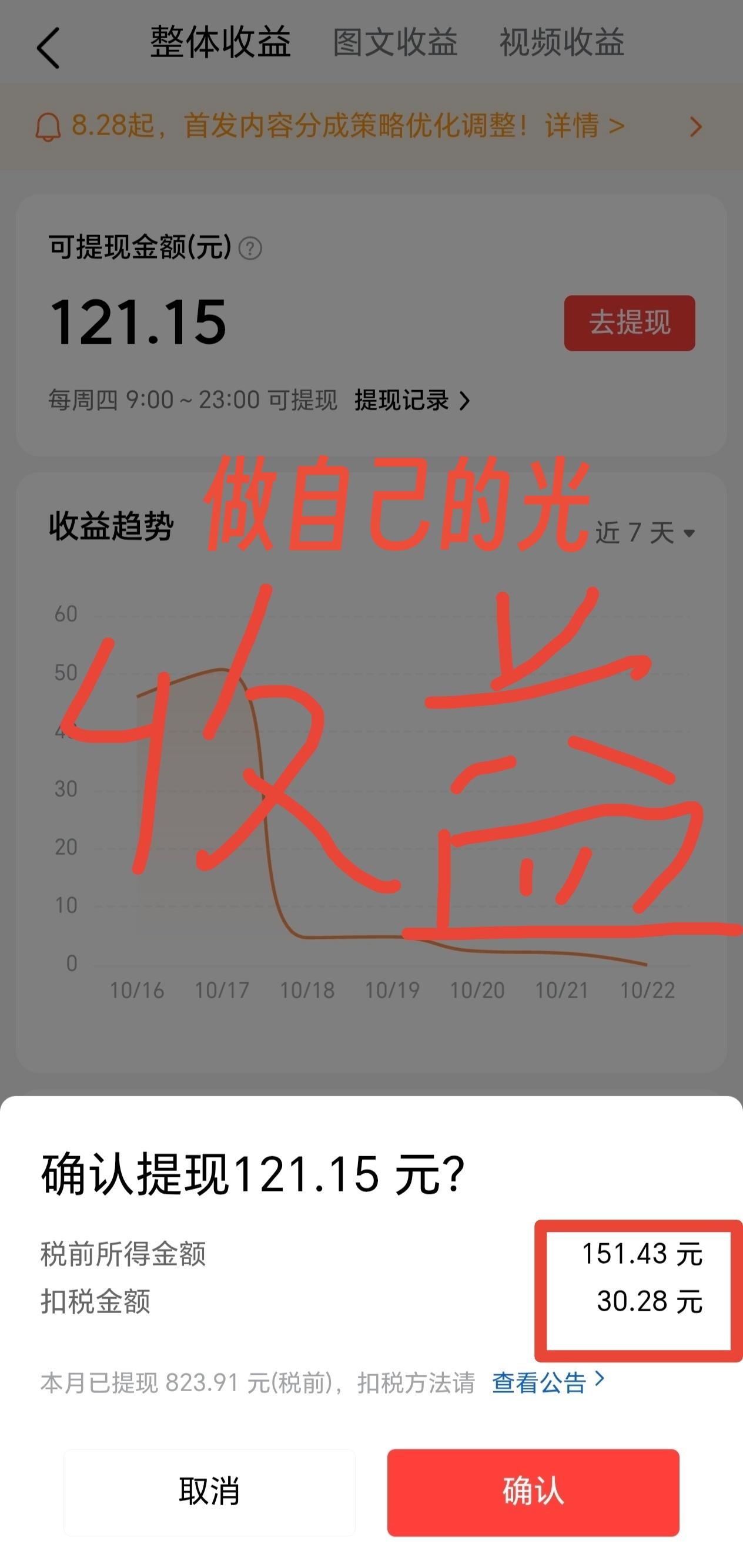 今天又是头条提现日啦!到账121.15元,税前是151.43,扣了30.28的税