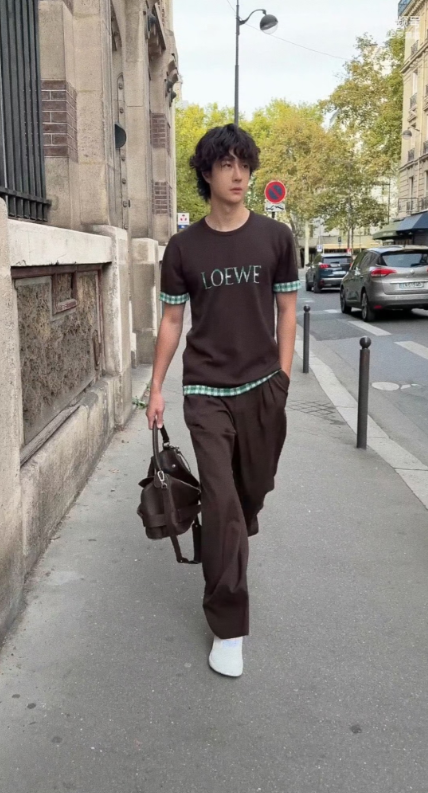 罗意威男模迈着大步迎面走来,好高好瘦的一长条。