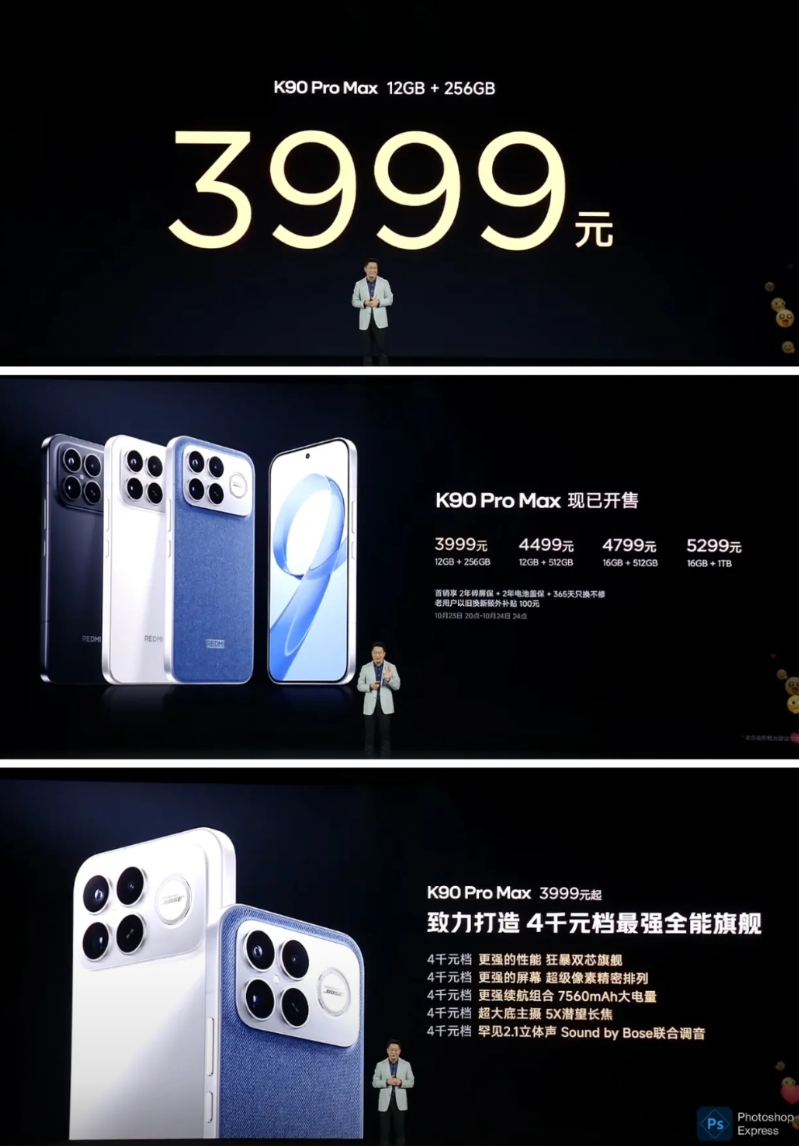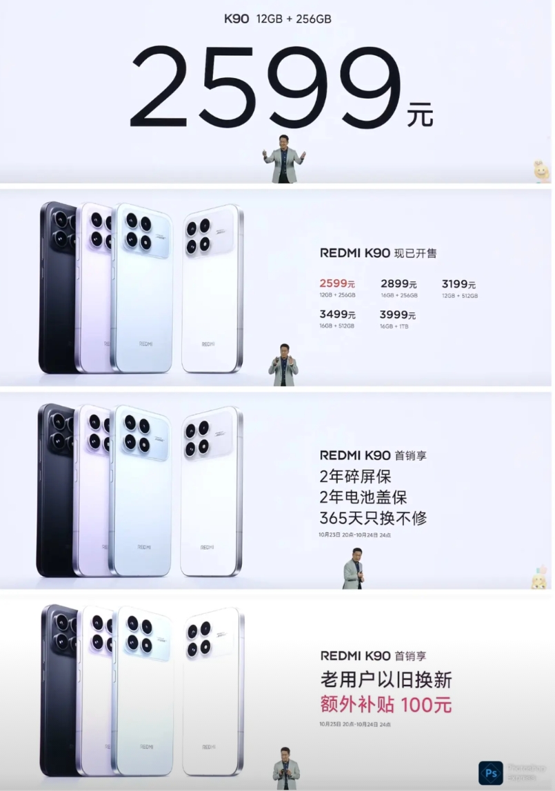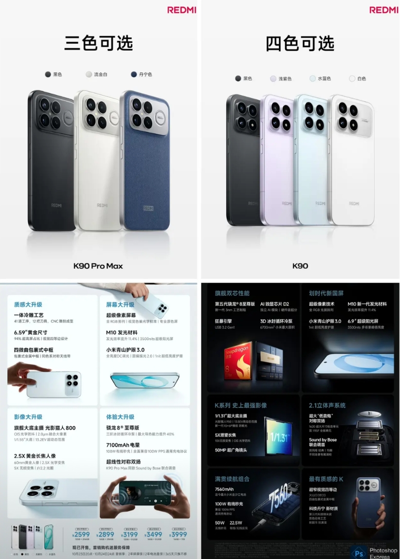 红米K90标准版,售价2599元至3999元;红米K90 Pro Max售价3999元至5299元。