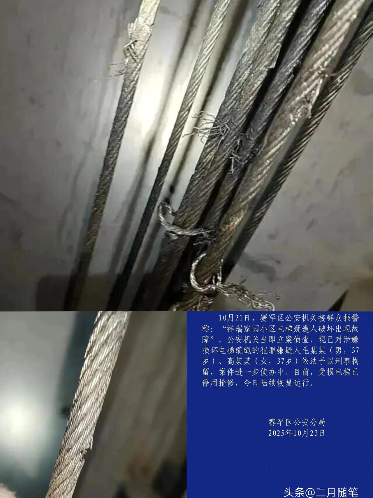 小区23部电梯的钢绳遭人为切割! 呼市警方今晨通报:毛某某(男,37岁)、高某某(女,37岁)已被刑拘! 呼和浩特那个小区电梯钢缆被割的事儿你听说了吗? 真的太吓人了, 这完全是在拿整栋楼居民的生命当儿戏啊! 幸好物业巡检的时候及时发现, 要不然哪天电梯真掉下来, 后果想都不敢想! 但这事越想越不对劲。 那两个人下手的位置特别准,一看就是懂行的! 绝不是普通业主闹情绪那么简单。 虽然小区最近确实因为物业费的问题有矛盾, 但一口气破坏23部电梯, 这已经不是发泄不满了, 根本就是蓄意破坏! 感觉背后可能还有更复杂的利益纠纷, 水挺深的! 现在很多老小区的电梯确实是个隐患, 维护全看物业用不用心, 普通业主根本摸不清状况! 这次呼和浩特政府反应挺快,已经要求全市小区给电梯加装AI摄像头, 能自动识别异常动作并报警,也算是给全国提了个醒! 电梯伤人 老人割断安全绳