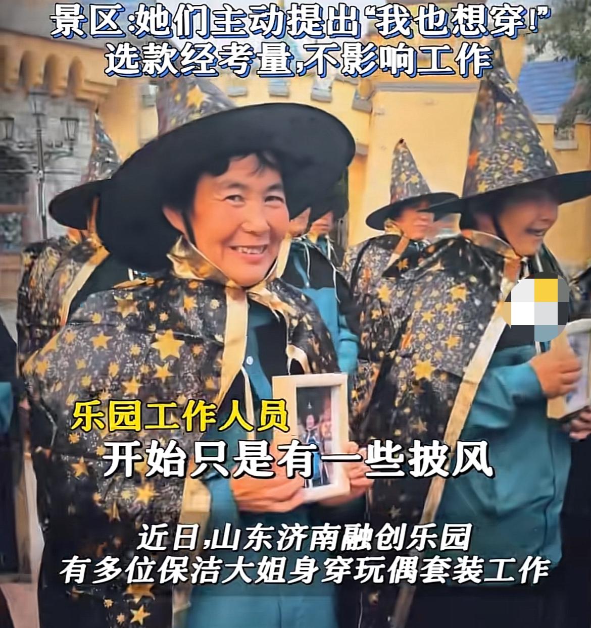 山东济南,一个游乐园里的保洁阿姨们引起大家关注,她们穿着卡通造型的套装,童趣十足,不过有人觉得她们是被强迫营业。 从画面来看,保洁阿姨们有的穿着魔法师的衣服,有的打扮成蟑螂或者垃圾箱的造型,还有的穿着便便服……形态各异。 这些保洁阿姨年纪都不小了,应该在50岁以上,穿上这些服装,一个个看起来有点滑稽。 有网友觉得这些阿姨应该不是自愿穿的,因为这些造型,比如蟑螂、便便啥的,有点不尊重人,为什么不选一些可爱的造型! 景区回应了,人家这些造型都是阿姨们自己选的,这个天气穿上,还挺暖和的。 看着阿姨们的笑脸,我们也觉得大家可能是多虑了,有人说,如果大家都穿,就都不尴尬,而且,那个蟑螂服,还有很多人表示喜欢,双马尾造型太可爱了。 有人表示,如果这个季节穿,倒是还挺好,夏天穿就太热了,游乐园得给这些阿姨加钱!