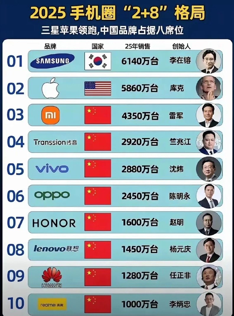苹果,在高端市场(单价600美元以上)的霸主地位在未来3-5年内依然稳固,但在整体手机销量上,中国品牌早已完成超越~