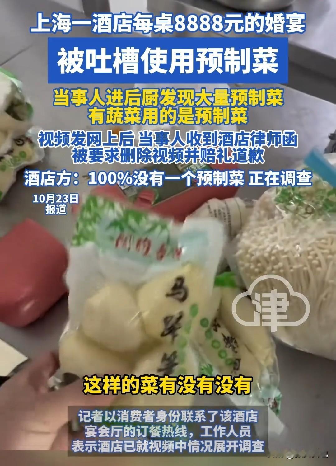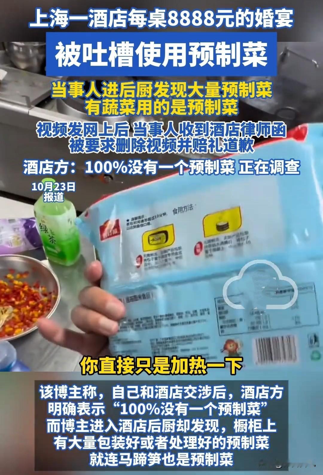 8888 元一桌的喜宴居然全部是预制菜?婚宴主人发视频吐槽反被酒店方发律师函! 近日,上海一位网友花三十多万,在某豪酒店举办婚宴,本以为 8888 元一桌的宴席应该能让宾客尽欢,没想到却被来宾吐槽口感不佳。 网友挺奇怪,按道理这个标准的餐食不至于被人吐槽不好吃啊?怀疑酒店是不是使用了预制菜,于是跑到后厨核实,果然在后厨发现了大量的预制菜,橱柜上到处都是包装好或处理好的预制菜,就连马蹄笋都是预制的! 网友愤而与酒店交涉,没想到酒店方拒不承认:百分百没有预制菜! 网友一怒之下,把后厨预制菜的视频发到了网上,没想到却收到了酒店方的律师函,称自己发布“不实言论”,要求自己删除视频,并且公开向酒店方道歉。 这位网友肯定不服啊,于是联系了记者,这个时候该酒店仍然辩称没有预制菜,但会对视频情况进行调查。 这是不是8888含泪小赚7888 呀?看来以后摆酒席准备10个微波炉就行了哦。 而且这酒店牛掰啊,做错事还要别人道歉,妥妥的倒打一耙用得贼溜啊。 有热心网友建议:还是去农村办喜宴吧,100%现炒现做哦,料真味道好!八千一桌在农村除非全是烟酒,不然想花都花不了。一桌十人,每人一条大叶子才能花八千。不然花不完啊! 难怪现在厨师工作难找了,这哪里还需要厨师啊?整几个微波炉就 ok 罗。 结婚都用上预制菜了,这还有啥不是预制的呢?大家说说看。
