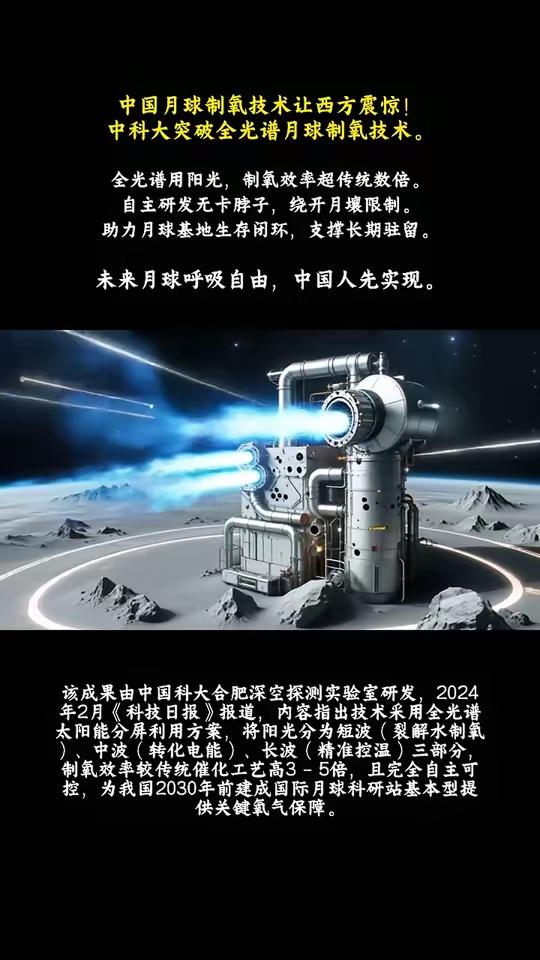 中国月球制氧的技术让西方国家感到震惊,制氧技术用全光谱来解决这一难题,未来在月球上可以呼吸自由,中国的载人航天登月也在进行当中,可能最晚在2030年就可能实现载人登月! 我的计划是在月球上面打造月球基地,月球将是中国继深空探索的一个基地,也是一个跳板!未来月球将成为中国打造新的一个基地!