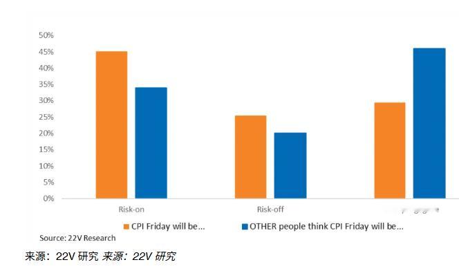 22V Research进行的一项调查显示,45%的投资者认为CPI公布后市场将呈现“风险偏好”走势,26%认为将是“风险回避”,29%则预期“反应温和或不明显”。这是自7月以来,投资者首次更倾向于市场将作出积极反应。调查还显示,61%的投资者认为核心CPI正处于“有利于美联储”的下降轨道,这一比例较上月有所上升。