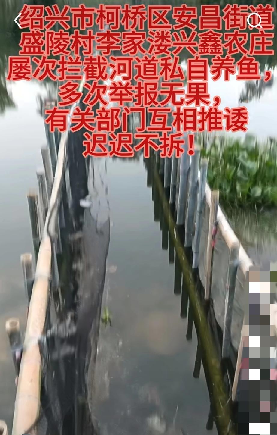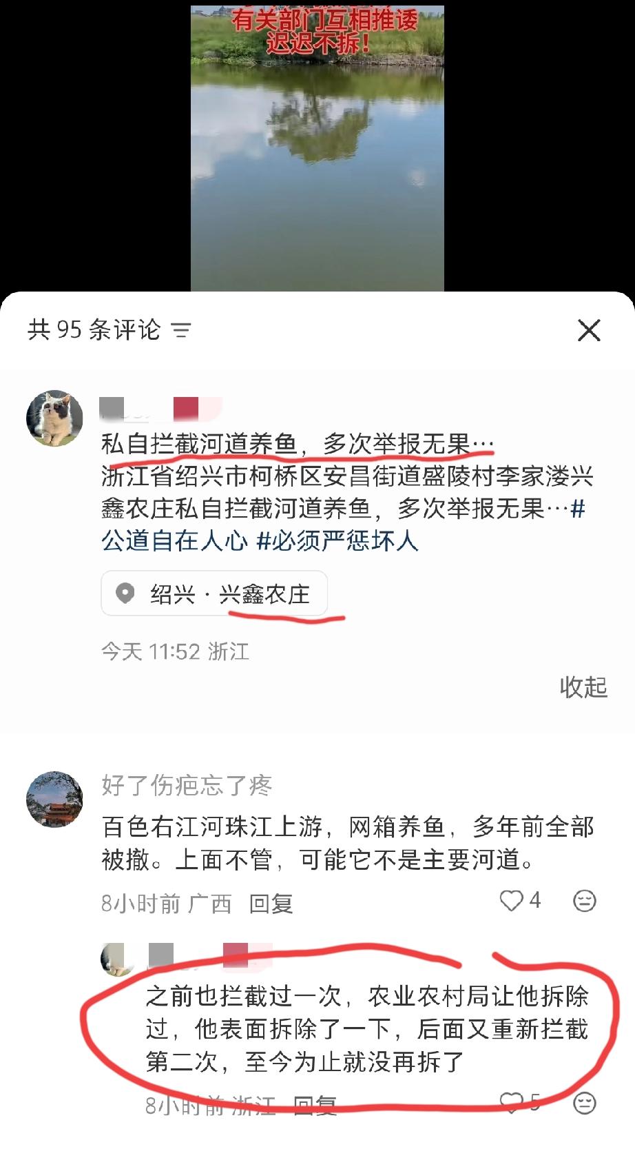 浙江绍兴,网友发视频爆料:位于柯桥区安昌街道的兴鑫农庄私自拦截河道养鱼,多次举报无果…… 据这位网友:农业农村局曾勒令其拆除过一次,后面又重新拦截起来了…… 有其他地方的网友表示:只要不是在主要河道,类似的情况还是很多的。基本这类人都是有关系的,而且一般乡镇、县区一级的执法部门是奈何不了他们的。 各位看官,你们当地有这样的现象吗?