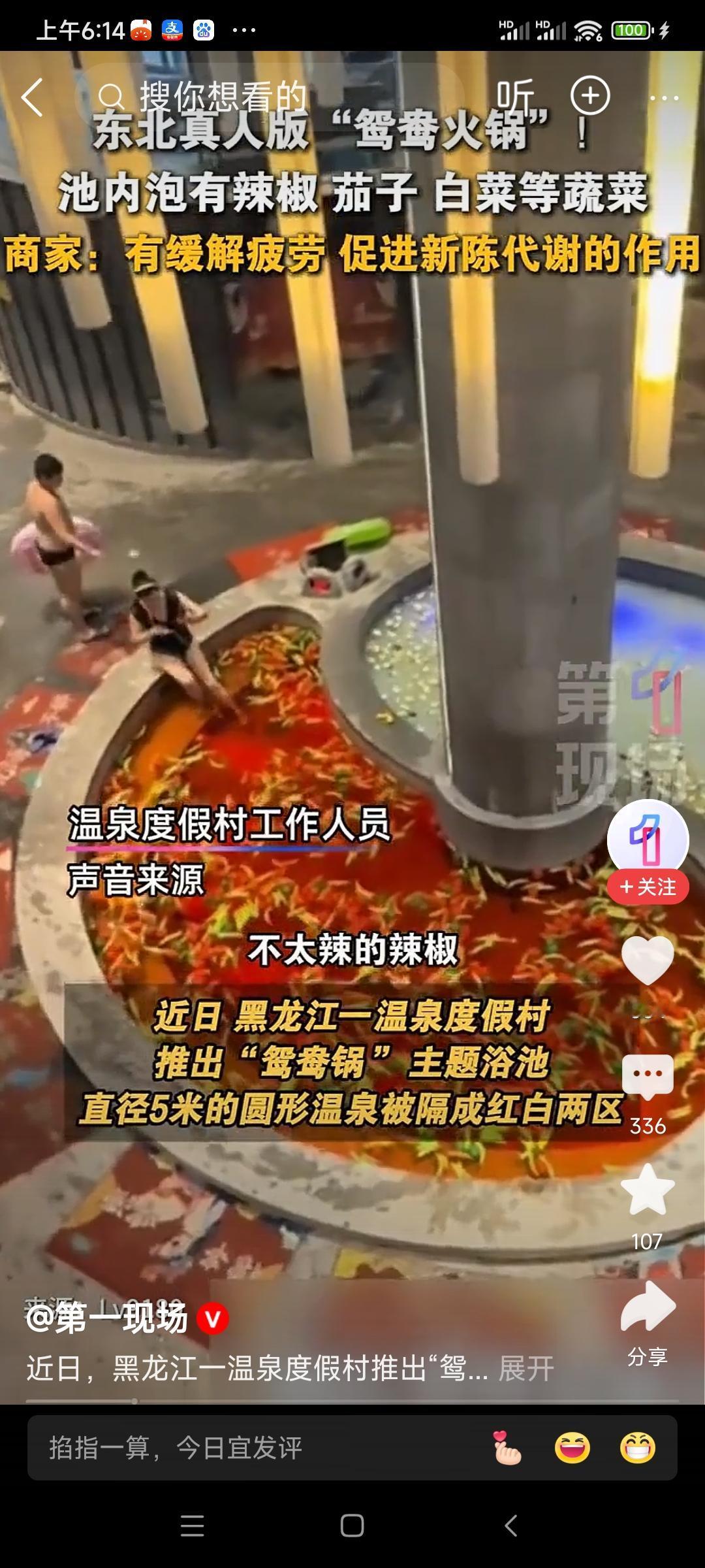 东北鸳鸯火锅浴池 黑土汤池分两色,热汤翻滚似锅开。 鸳鸯巧借人间味,暖透寒冬