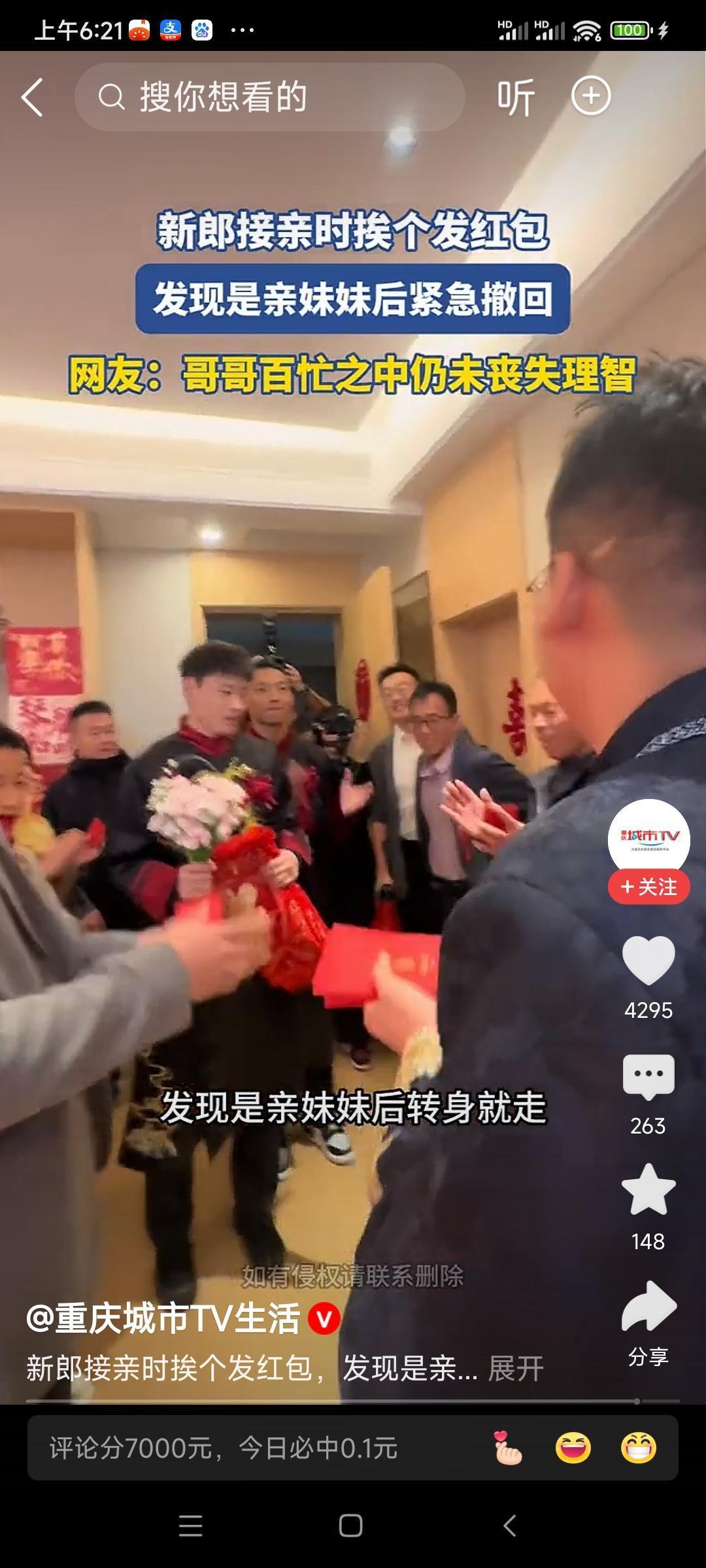 新郎撤红包 喜宴接亲发利是,错点胞妹指尖驰。 慌忙撤回羞红脸,惹得满堂笑满枝。
