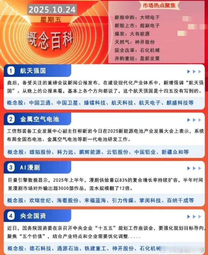 航天强国领衔!金属空气电池、AI漫剧等热门概念股全梳理