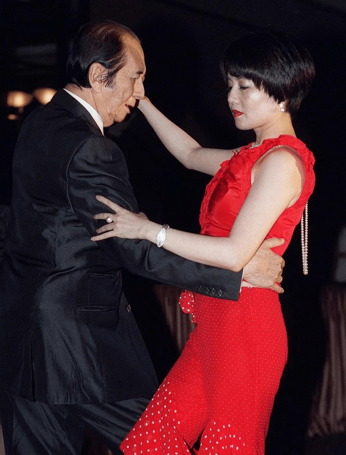 三太一身粉红色,四太一身大红色,她们年轻又会打扮,衬得赌王好老。