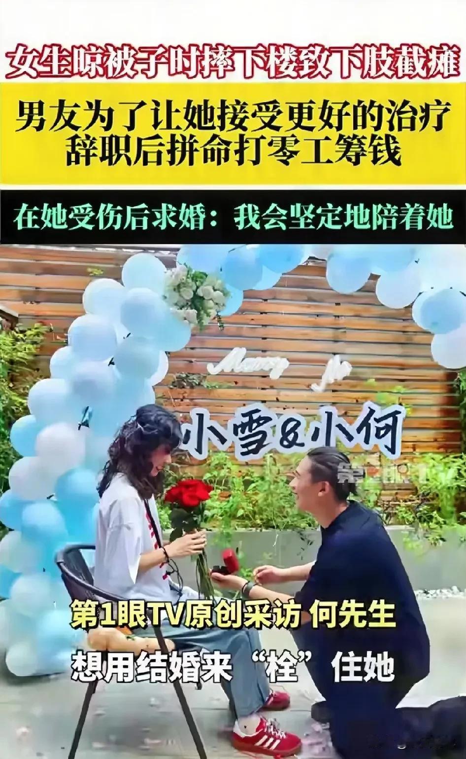 26岁女孩在家晾被子,哪料,一时失足摔下楼导致截瘫,女孩感觉天都要塌了,本以为自己的男友也会离她而去,没想到,男友的选择让她刮目相看。 男子叫小何,与女友自由相恋。 在他的心中,女友就是她未来的依靠,女友也把视作未来的归宿。 就在他们为了他们的未来打拼的时候,一场突如其来的意外却发生了。 这天,女友想把家里的被子拿出来晾一下,便拿着被子上了阳台。 没想到,一个没走稳,因重心偏移,裹着被子从3楼摔了下去。 她觉的虽然受伤,但也不至于那么严重。 可当医生拿出检验结果后,她整个人都傻了,腰部爆裂性骨折,伤到脊髓了,下肢瘫痪,大小便失禁。 她没想到,自己之前还活蹦乱跳呢,如今以后都要躺在床上,感觉上天跟她开了个玩笑一样。 女孩心灰意冷,无法面对自己以后的生活。 就在她痛不欲生的时候,22岁的男友出现了。 然而,女孩看到男友后,但没有一丝表情,而是一个劲的流眼泪。 经过一番挣扎,女孩的心才平静了下来,男友小何一直在旁边静静的呵护她。 但是,女孩的康复费用压的小何喘不过气来,他觉的自己那点工资确实不太够了。 考虑到经济原因,女孩妈妈把接老家做康复,一来能省下不少费用,二来妈妈可以更方便照顾女儿。 而小何为了自己的女友,能够更好的康复,也是一天打两份工,白天在咖啡厅兼职,晚上就在酒吧继续上班,一个月可以多点收。 此时小何的心里只有一个想法,那就是多赚点钱,然后寄给女友,让她安心的做康复。 可看到女友离自己又那么远,为了女友,他果断辞掉了这边的工作。 小何专程把女友小雪从山东接到杭州,也为了能更好的接受治疗。 可女友越来越觉得,自己有点拖累小何,就想放弃治疗。 没想到,小何了让女友安心治疗,竟然在七夕这天,单膝跪地向女友求婚。 女友激动的眼泪都掉了下来,半天都说不出话来。 小何对着女友说:“以后不管发生什么事,我都会在你身边,一直陪你到老。” 女友静静看着小何,一言不发,但心里却是甜的。 不难看出,当男孩单膝跪地的那一刻,女孩的眼泪里不只是感动,更是一种重燃的希望。 对很多人来说,爱情是花前月下,但对于经历过苦难的人,它更是一种不离不弃的坚守。 有人用金钱衡量爱情,有人用时间证明真心,而这场求婚,用的是责任和陪伴。 它告诉我们:爱的最高境界,不是浪漫,而是在你最不堪的时候,依然把你当作生命中的光。 来源:第一眼