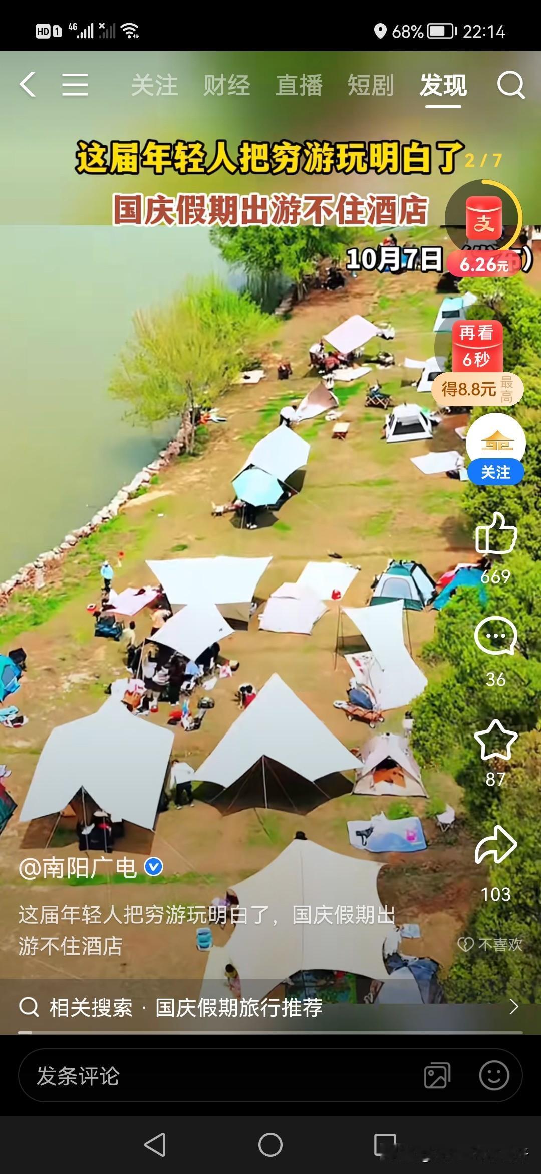 帐篷里的放松 适者生存是不泯灭的道理 现在的年轻人也终于能够让自己适应环境了,穷日子过得,富日子也过得。不能单纯让自己像温室的花朵,离开优渥的环境就会凋零。 据说国庆假期很多年轻人选择带着帐篷出行,给了那些借机涨价的酒店一击。 一排排的帐篷罗列在各式各样的车旁边,像一朵朵美丽的花,非常赞许年轻人的勇敢和对约定俗成的规则的挑战。 平时住一晚一百二百,节日一两千,而职场人只能节日出行,那我们就以天为被,年轻人终于被激发出豪情万丈! 一开始不理解为啥好好的家里床不睡去睡野外,后来九边的一句把环境清零还是打动我心了。 是的! 我当时上班烦的时候最让我舒心就是回妈妈身材,和她一起挖野菜,竟然感觉自己回到村姑小芳的样子,没有任何戒备,依偎在母亲膝下是最美好的日子。