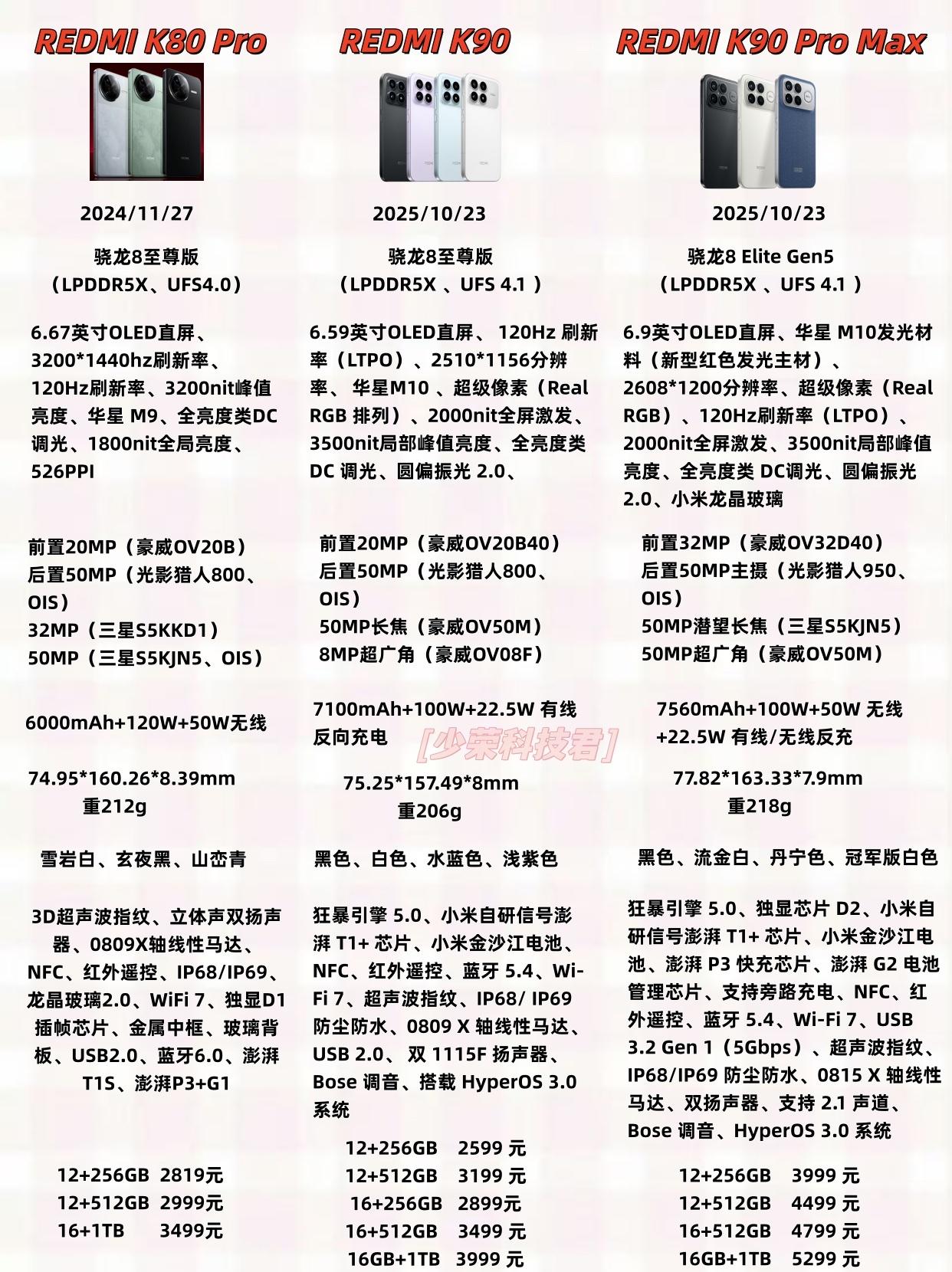 REDMI K80 Pro🆚REDMI K90🆚REDMI K90 Pro Max配置对比图来了。 REDMI K90系列配置提升明显,连标准版K90都有超级像素排列,电池容量也都是7000+,续航无忧,不知道怎么选的朋友可以参考一下。红米 K90